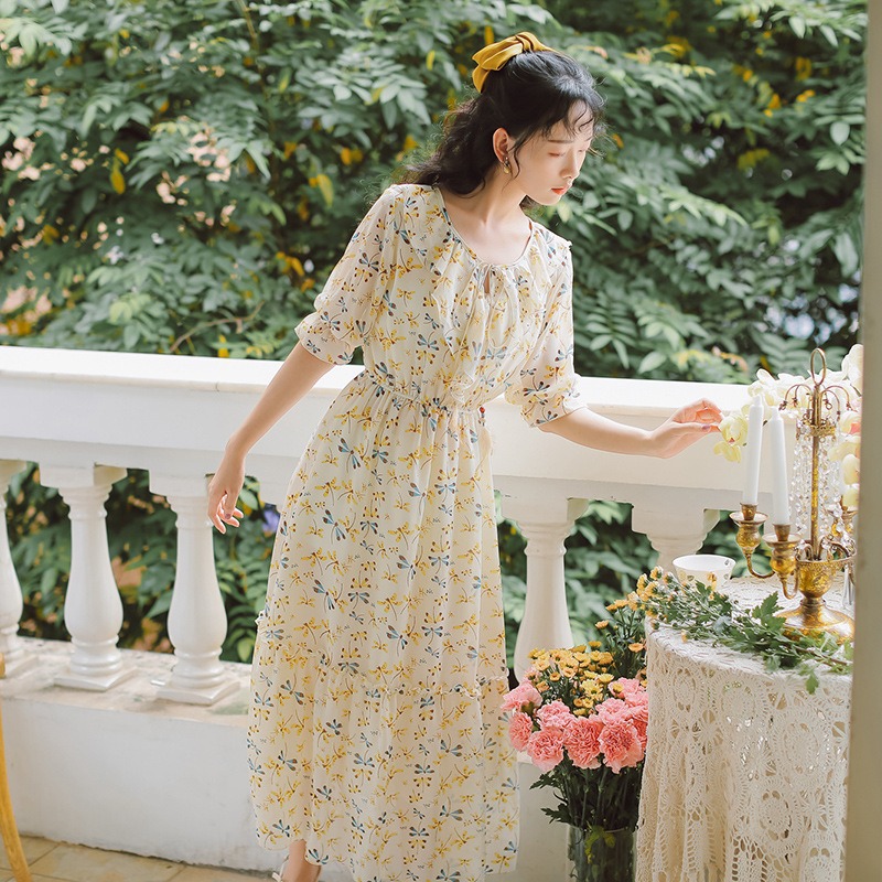 A new sweet floral dress for women in summer 2024, with a cinched waist, flared sleeves, LACES, a large hem and a small dragonfly that covers the legs