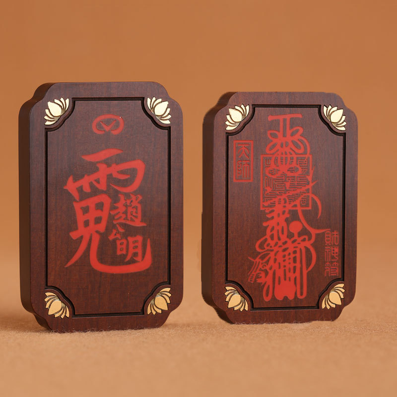A pendant made of lightning-struck jujube wood and inlaid with raw cinnabar, featuring Marshal Zhao Gongming, the God of Wealth, a Taoist ritual artifact, and a rainbow-ear necklace