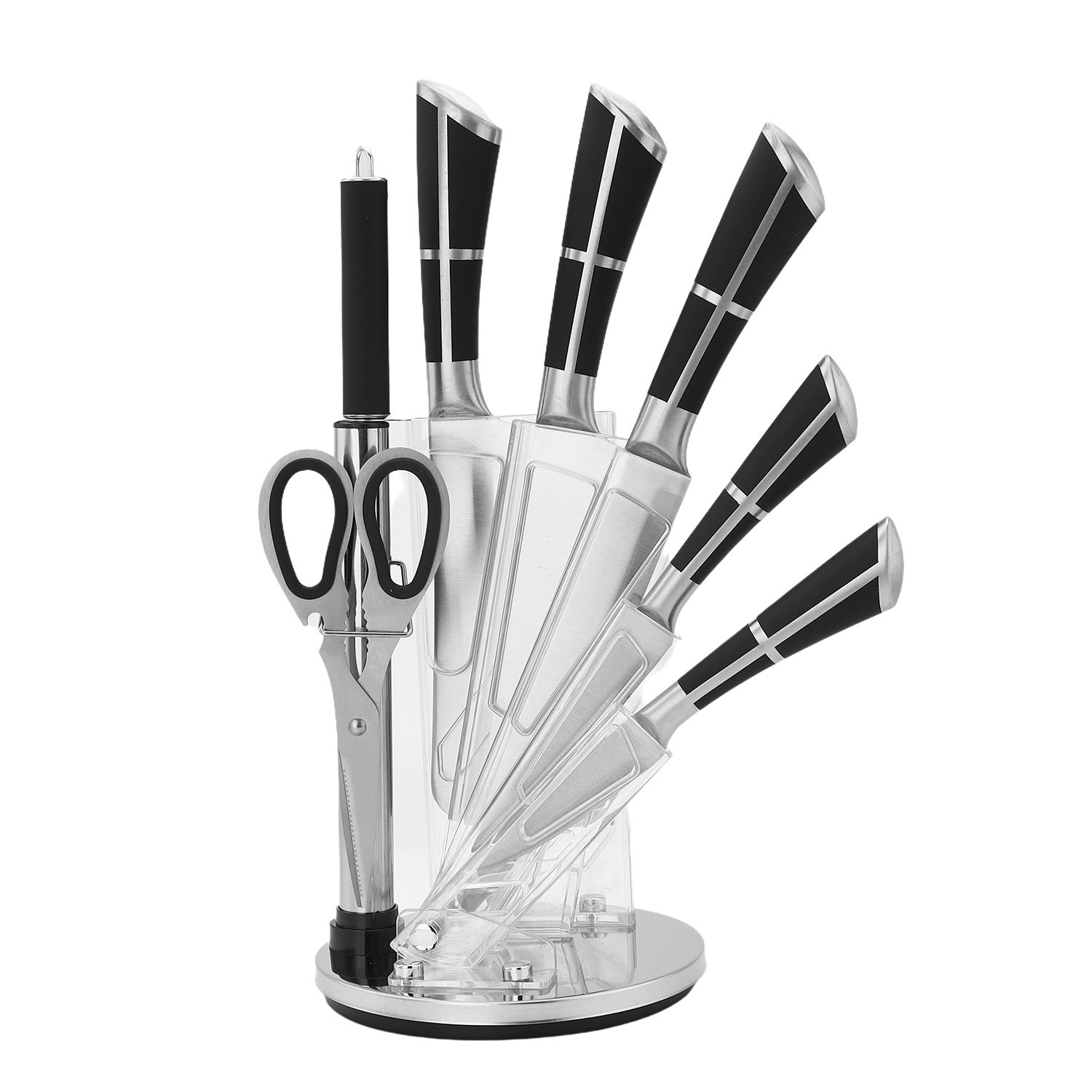 A popular foreign trade set of eight-piece stainless steel sharp kitchen knife with a horseshoe hollow handle and a rotating knife seat