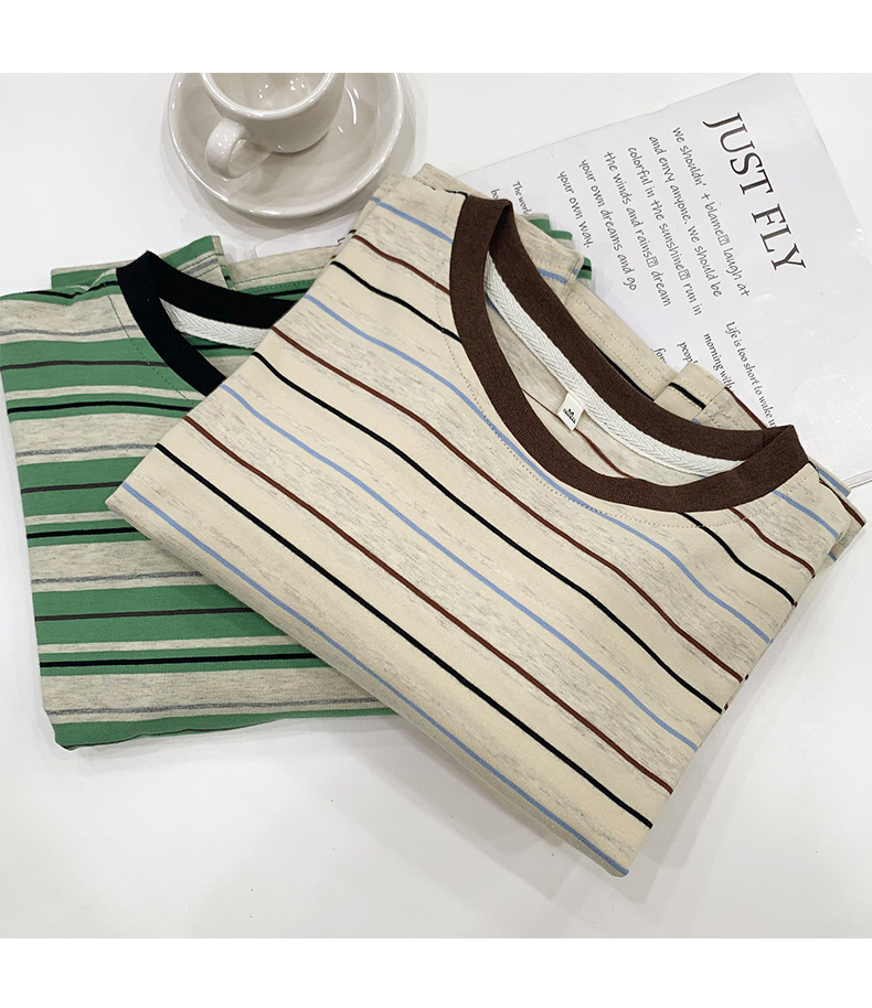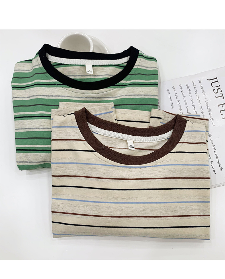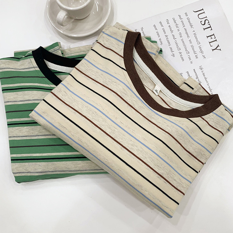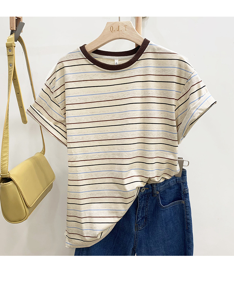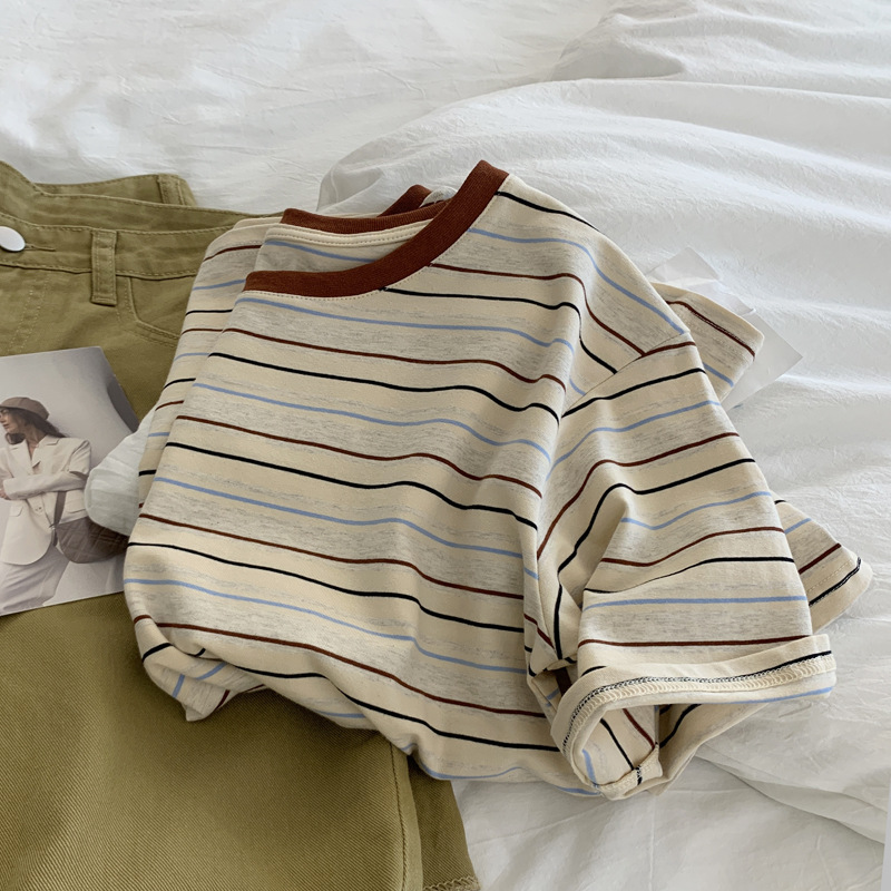 A retro and gentle Korean-style short-sleeved T-shirt with a contrasting color stripe neckline for women's summer loose, versatile and stylish round-neck top for hair replacement