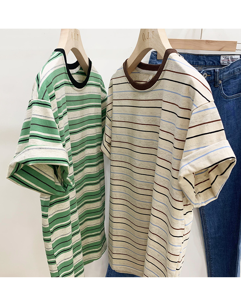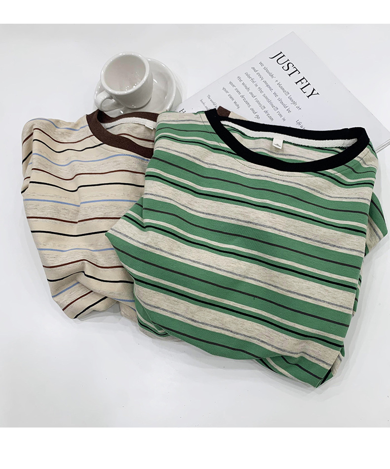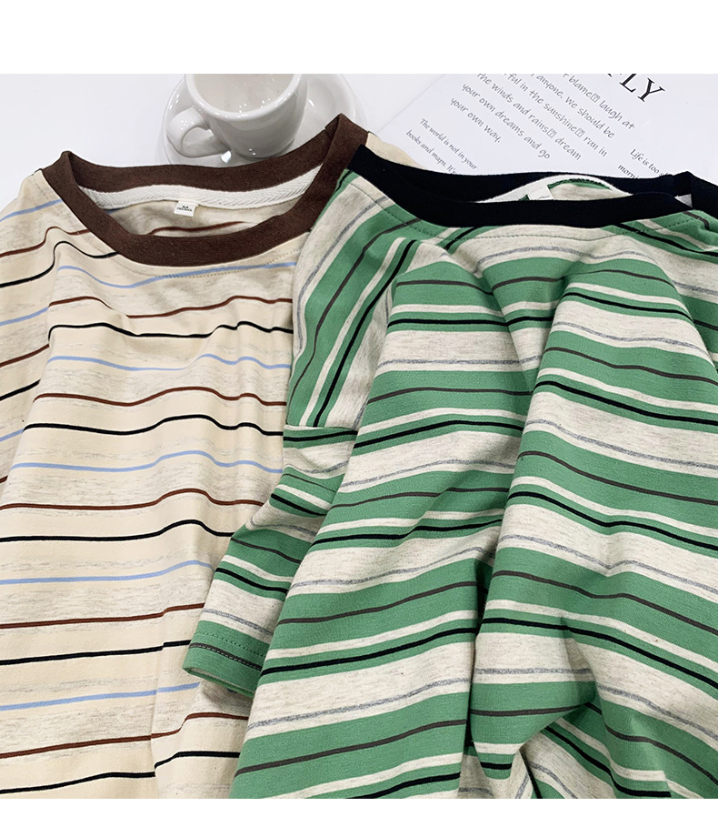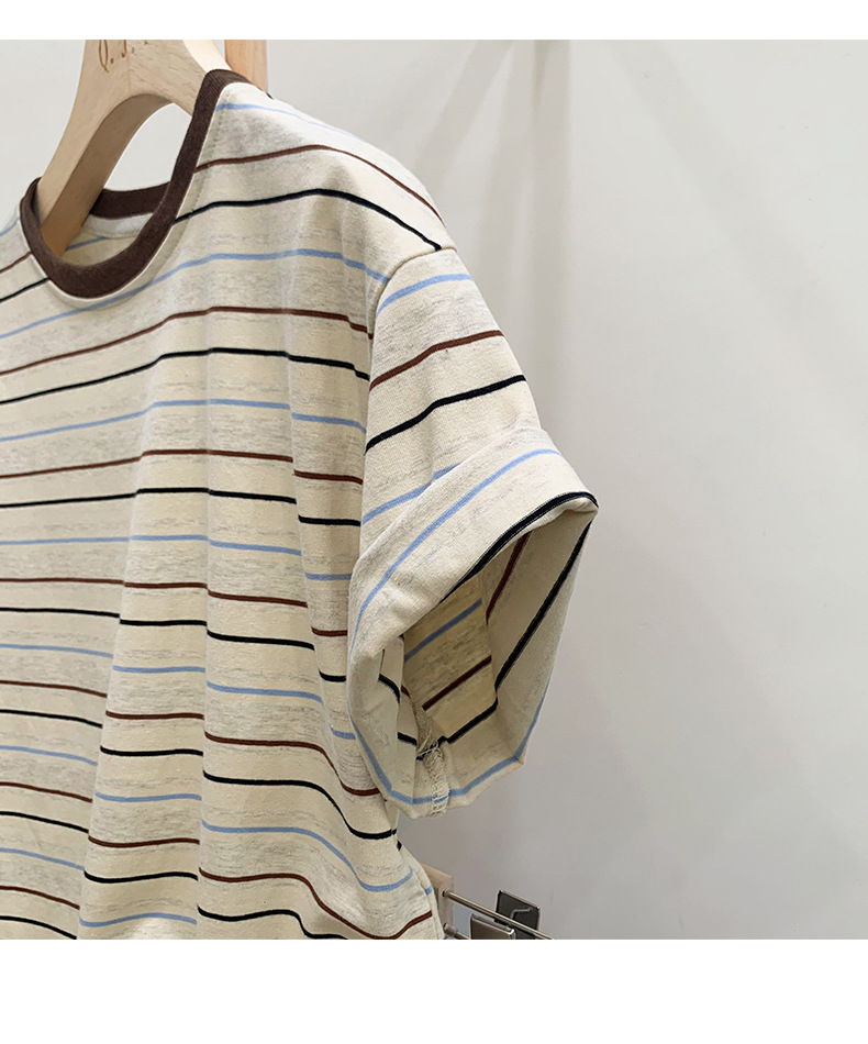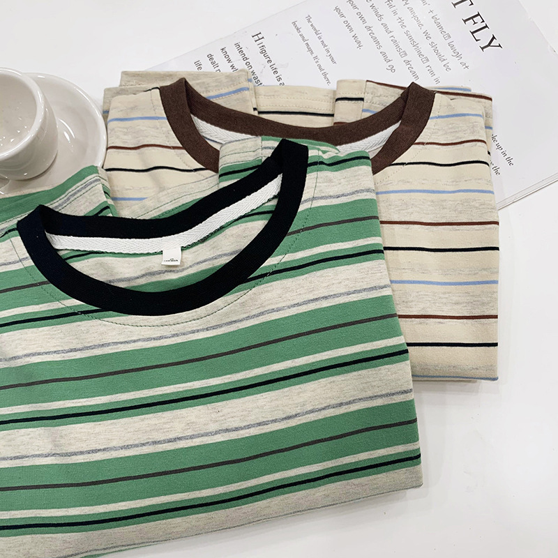 A retro and gentle Korean-style short-sleeved T-shirt with a contrasting color stripe neckline for women's summer loose, versatile and stylish round-neck top for hair replacement