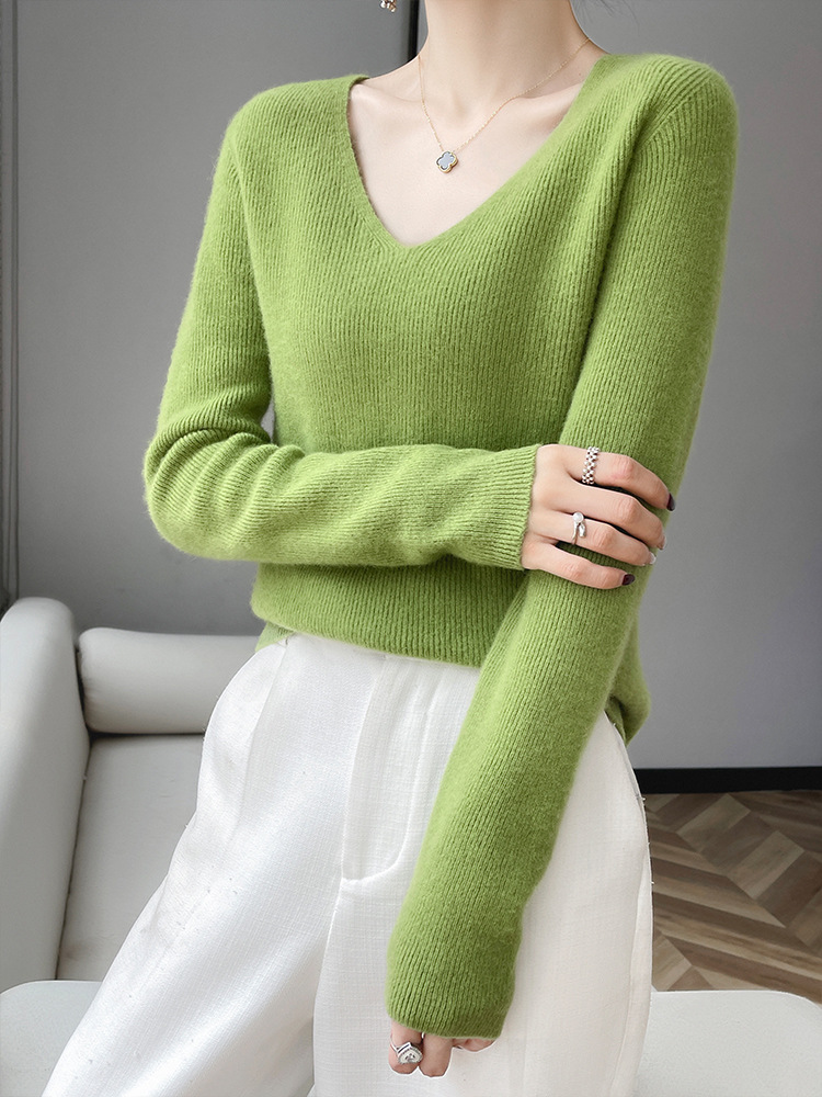 A seamless 100 pure wool sweater for women with a V-neck, slimming and form-fitting look. Pair it with a cashmere base knitted sweater for winter