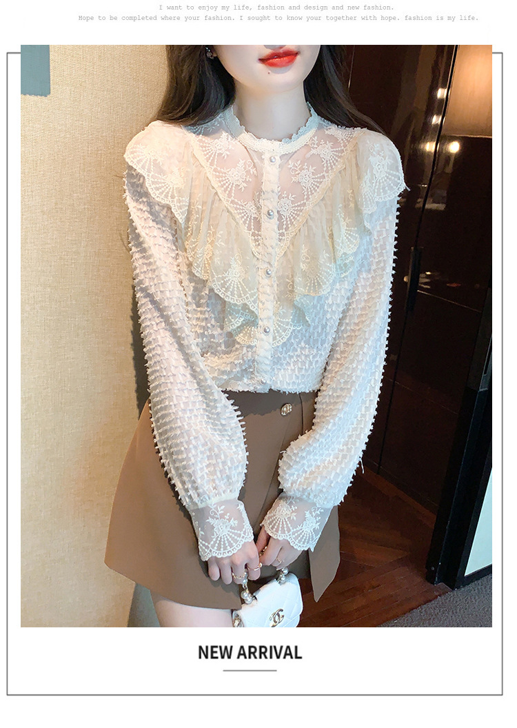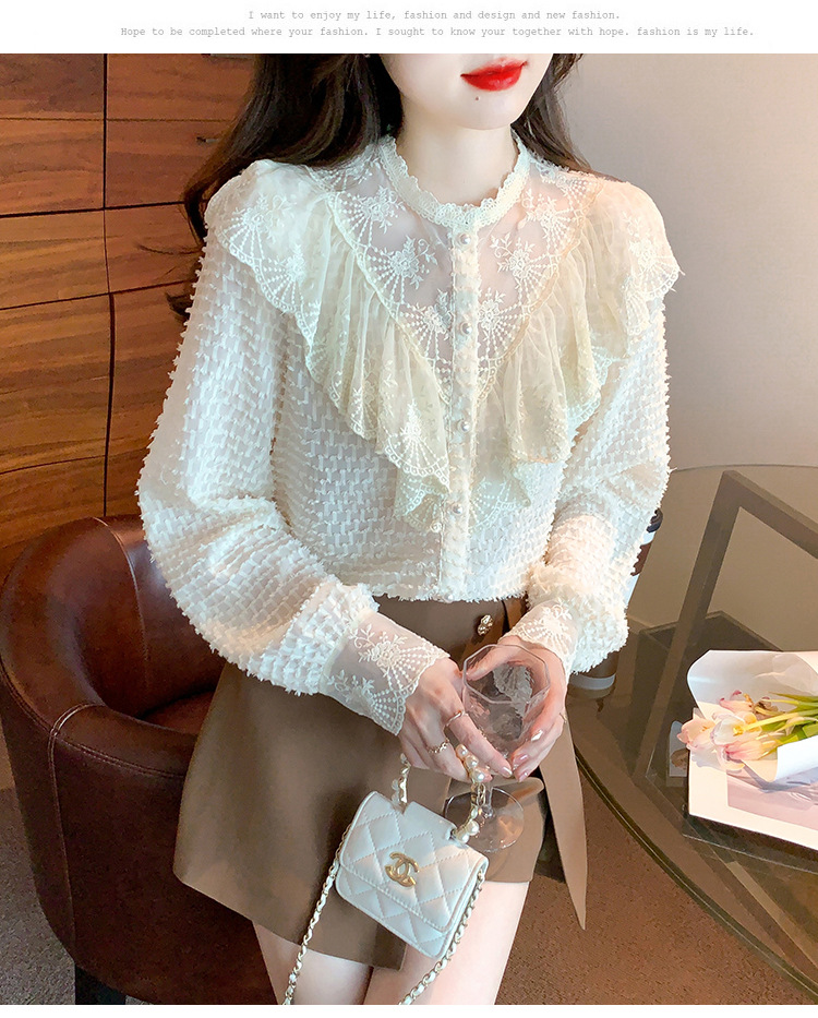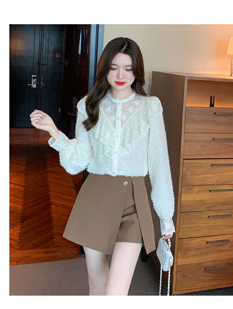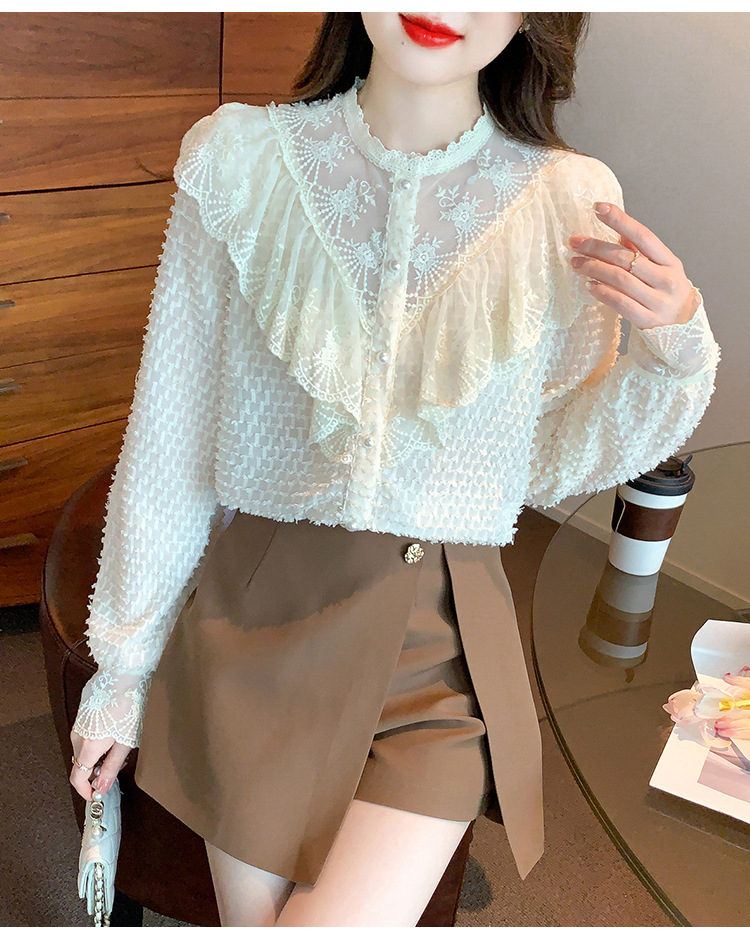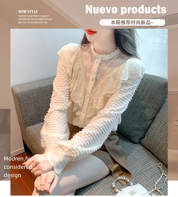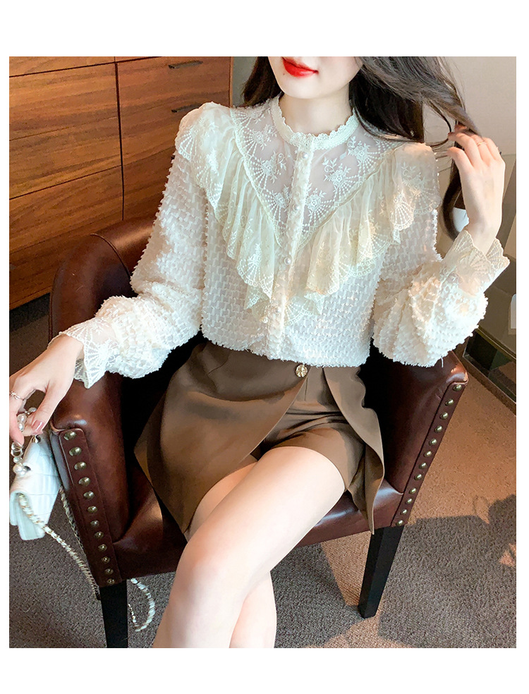 A semi-high-neck chiffon top for women's spring collection in 2023, featuring a stylish inner layer, a long-sleeved lace base layer and a top