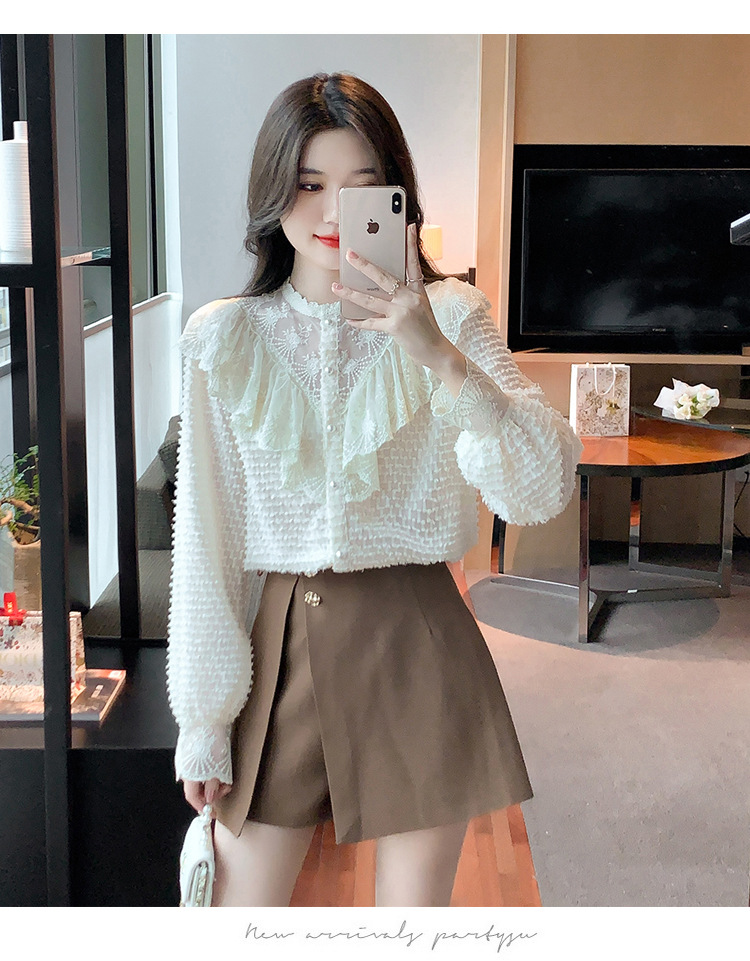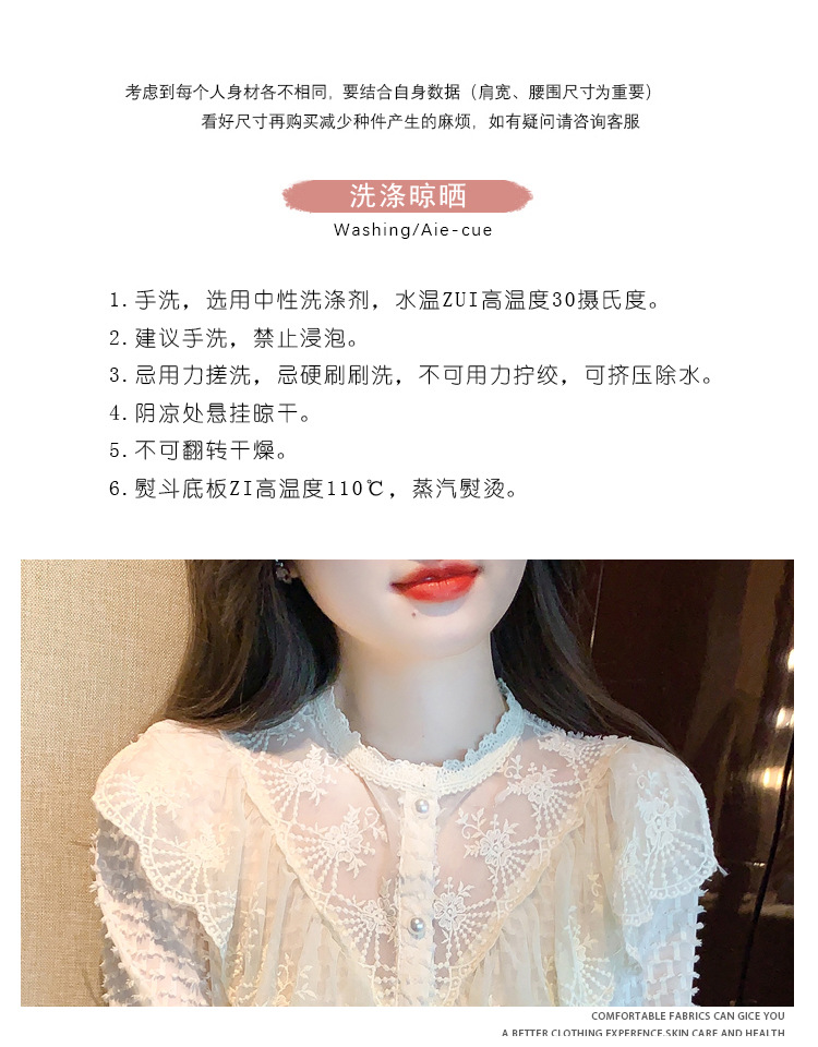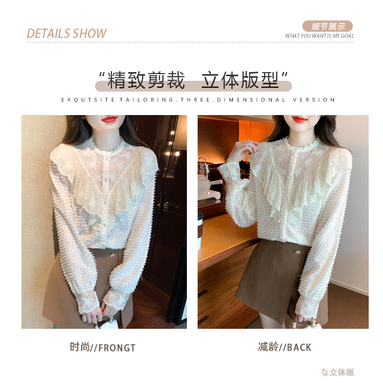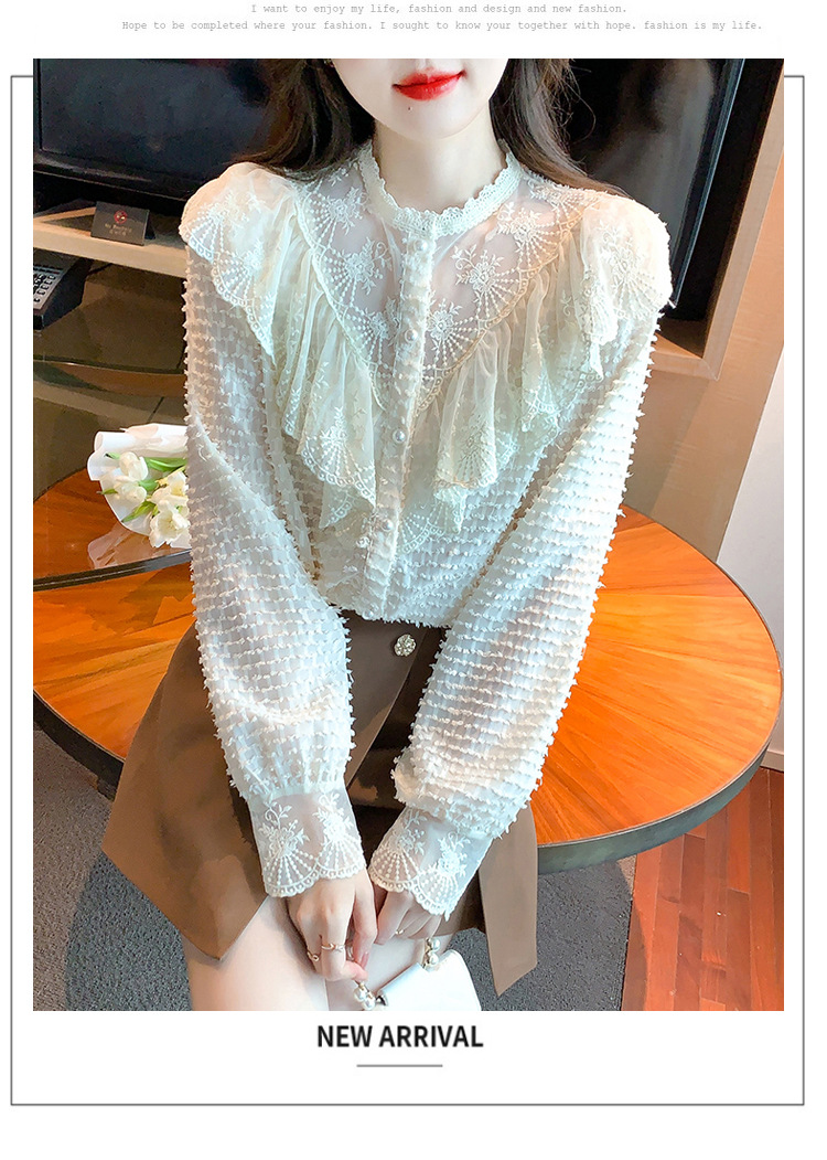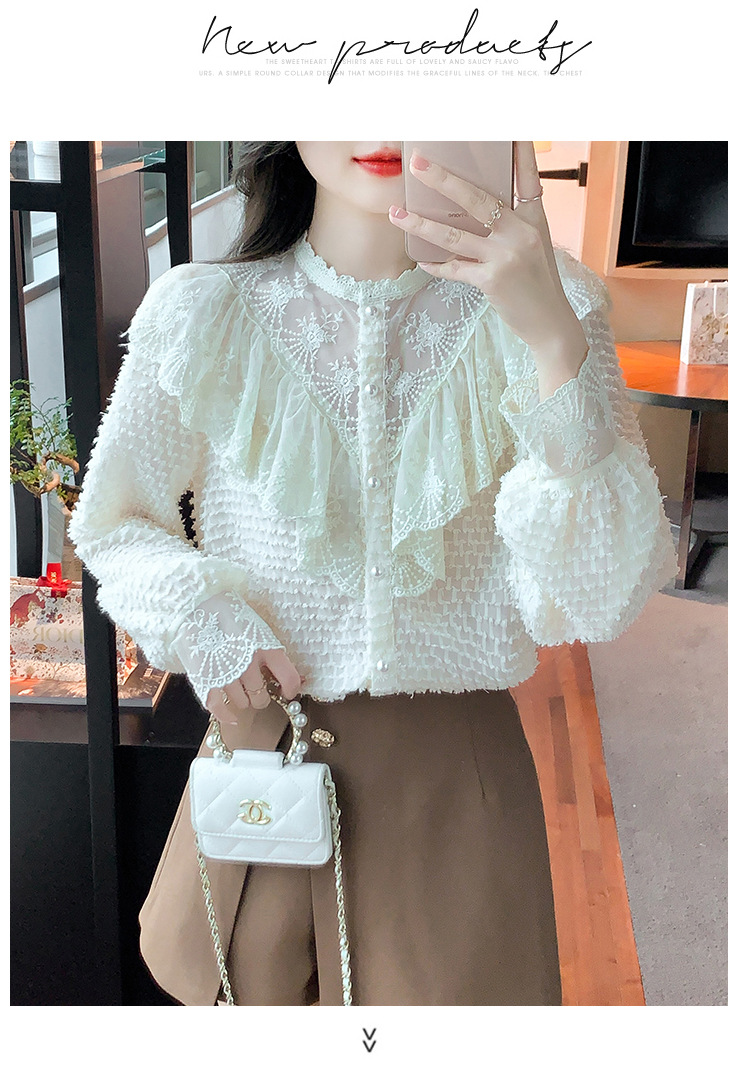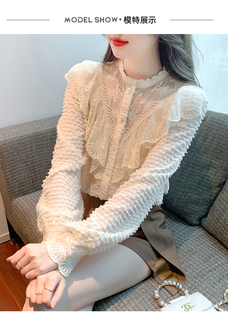 A semi-high-neck chiffon top for women's spring collection in 2023, featuring a stylish inner layer, a long-sleeved lace base layer and a top