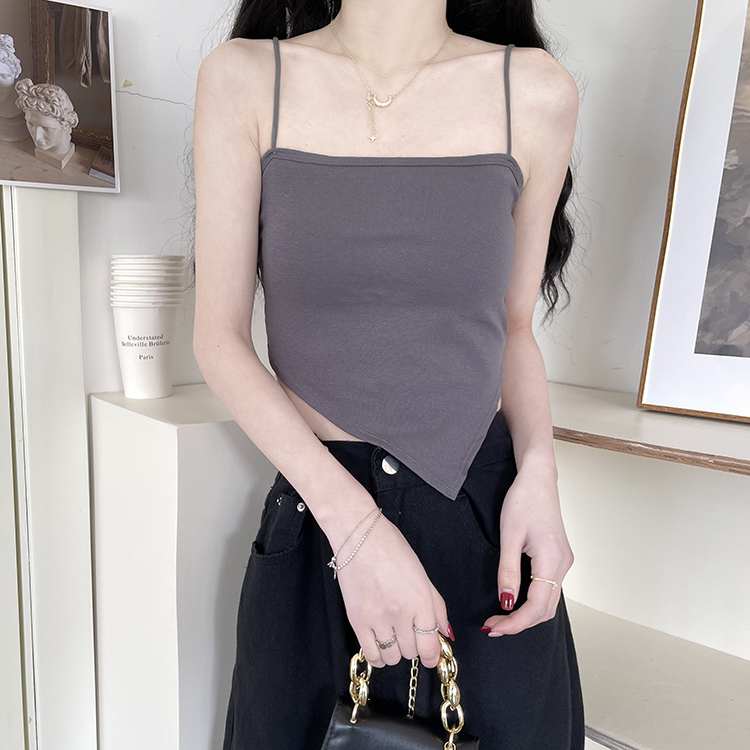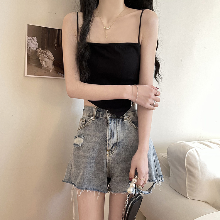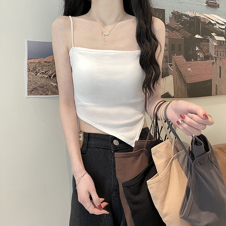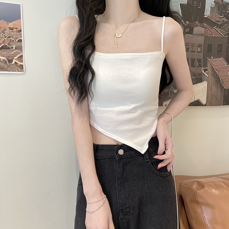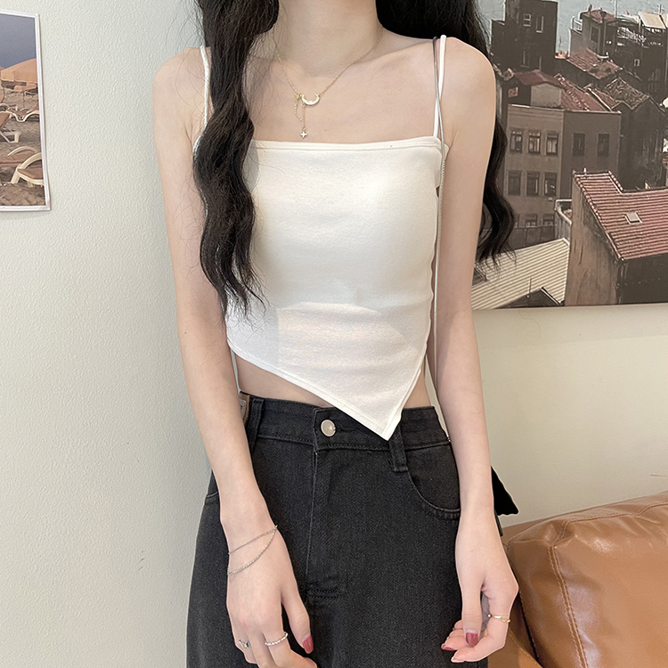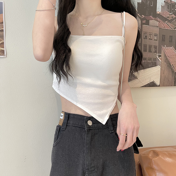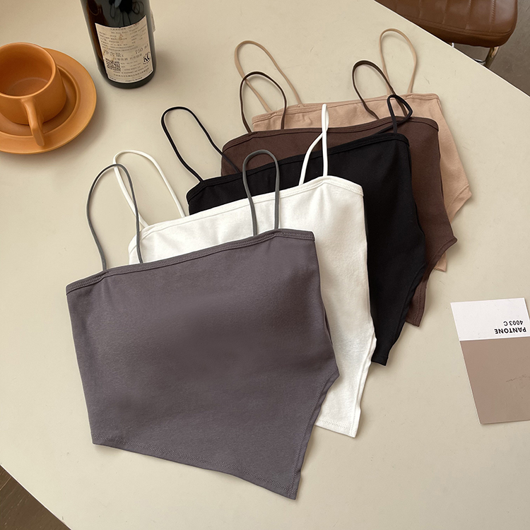 A short white halter top is worn inside as a women's anti-exposure off-the-shoulder bra with a chest pad for autumn