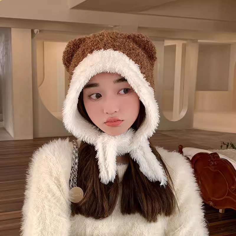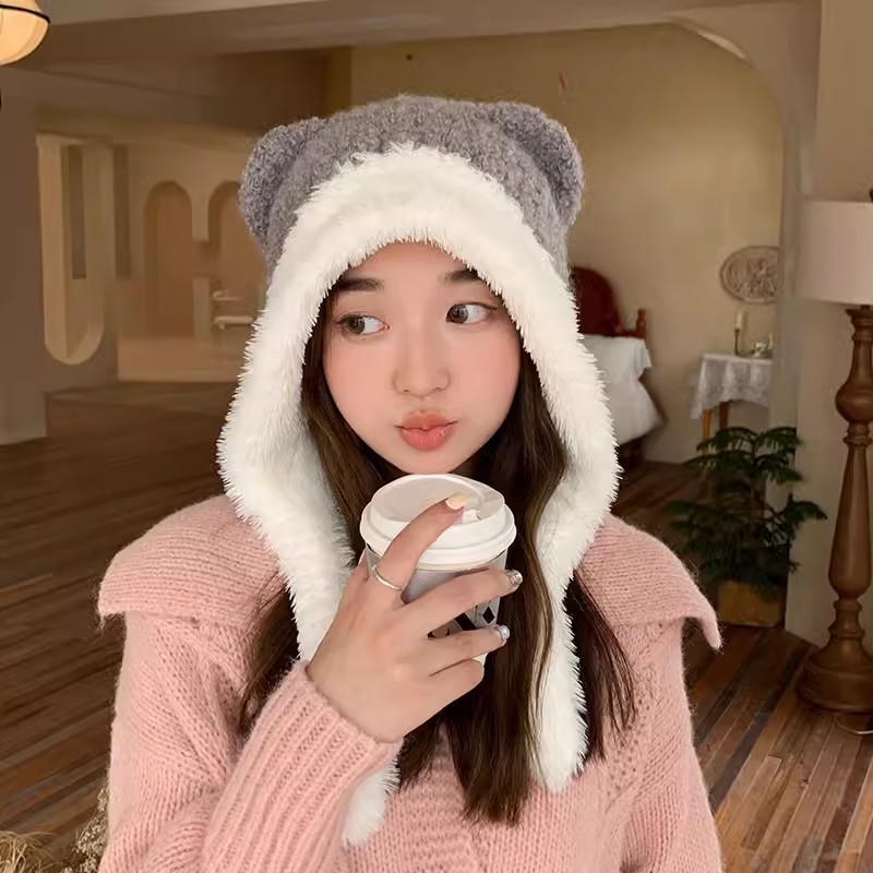 A sweet and cute winter hat girl with a little bear tie for warmth and thick woolen cap that makes her face look good. A small, big-headed knitted cap
