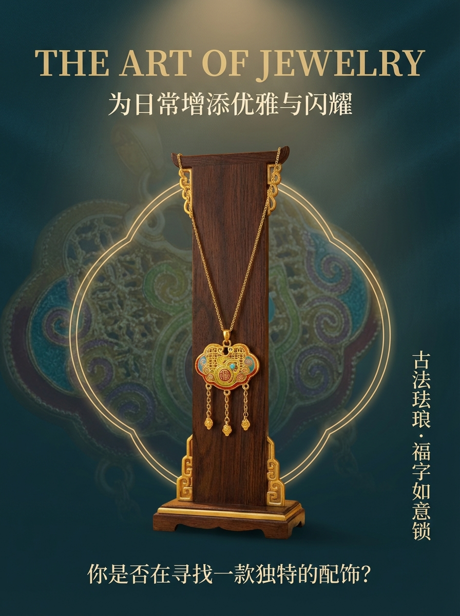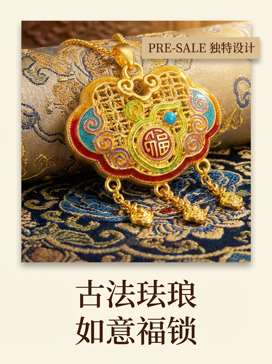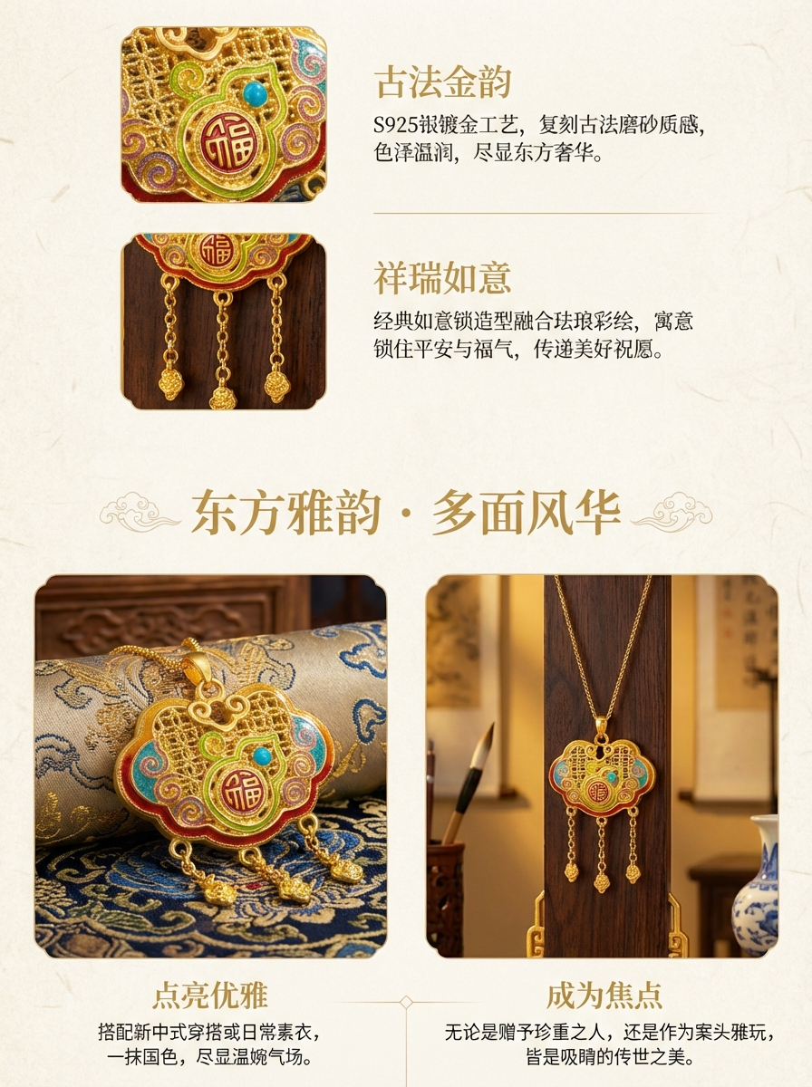 A traditional Chinese gold "Fu" character hand-carved, gold wrapped in silver and inlaid with auspicious clouds to bring good fortune, gold enamel pendant necklace