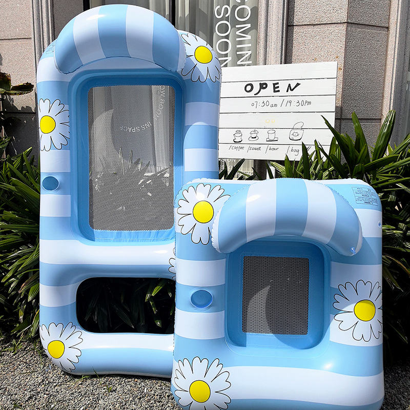 A water lounge chair with a retro striped floral print backrest that has become a popular adult, a floating bed with a cup of water and a drink