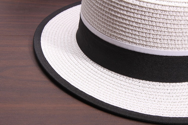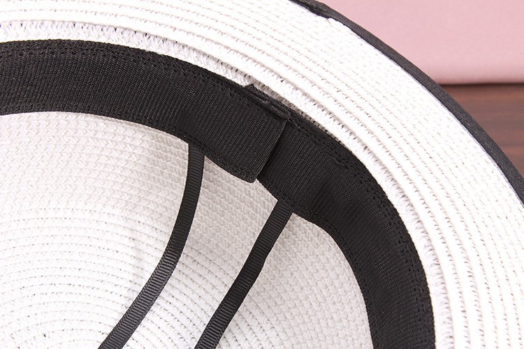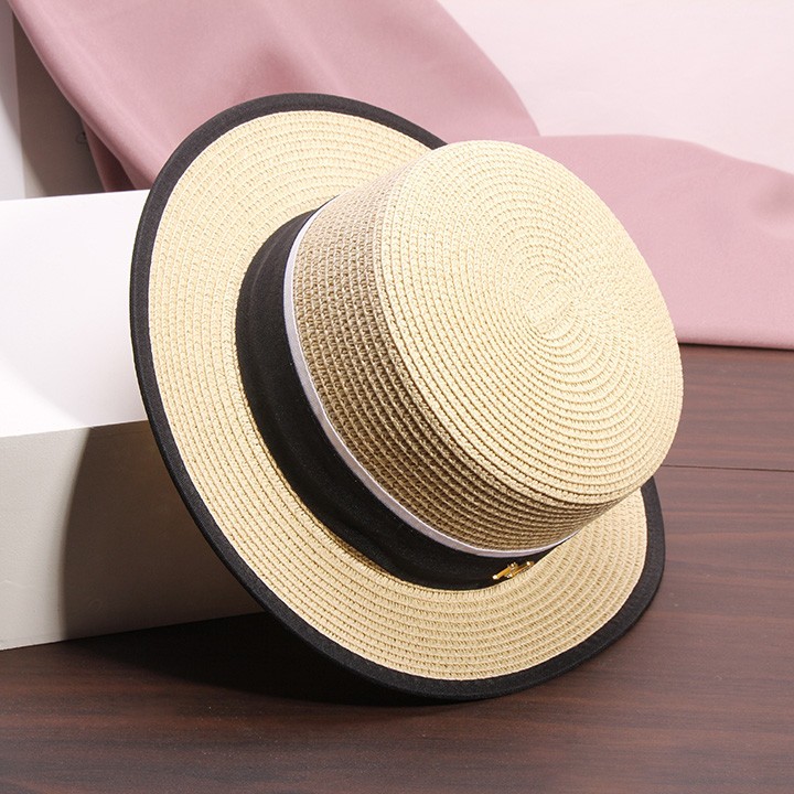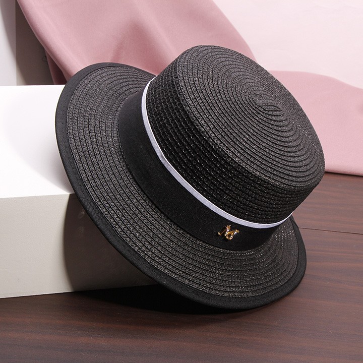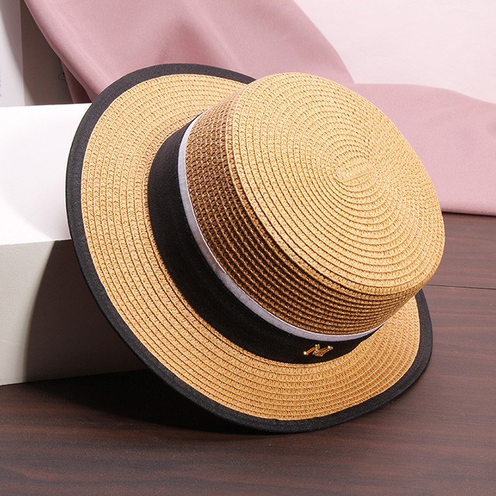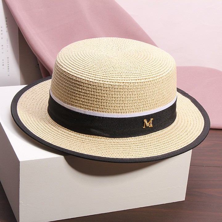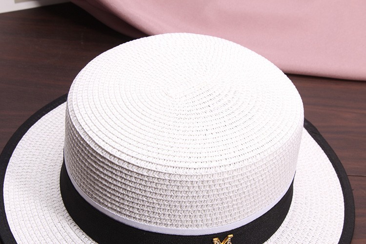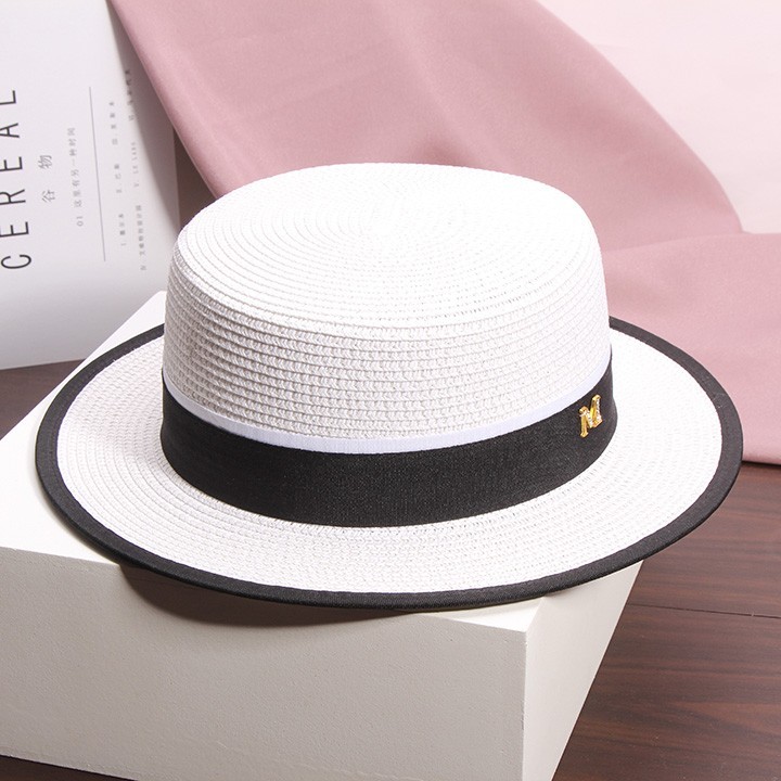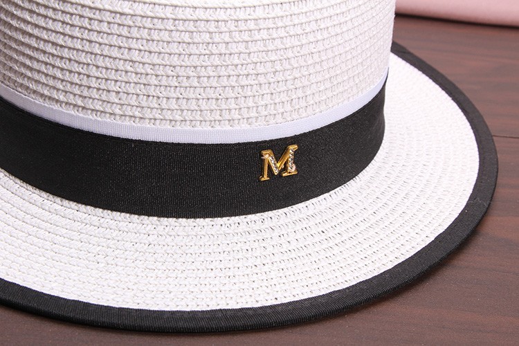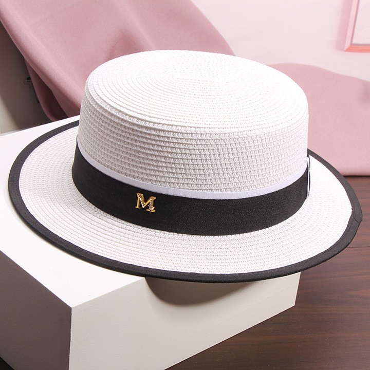 A white flat-topped straw hat with an M logo, a female summer outing sunshade beach hat, a model's catwalk performance, and a fashionable top hat
