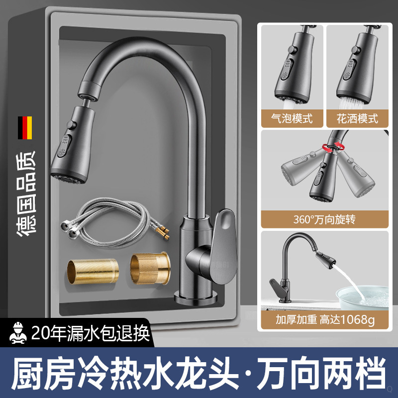 All-copper kitchen hot and cold water faucet, pull-out household sink, multi-functional anti-splash water pressure-increasing faucet