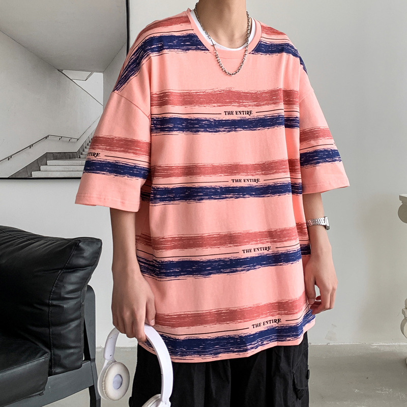 All-cotton striped short-sleeved T-shirt for men in 2024, a versatile and loose five-quarter sleeve pure cotton T-shirt for Hong Kong-style teenagers, a trend in clothing