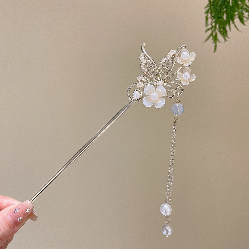 70# Butterfly Pearl Flower Tassel Hairpin - Gold