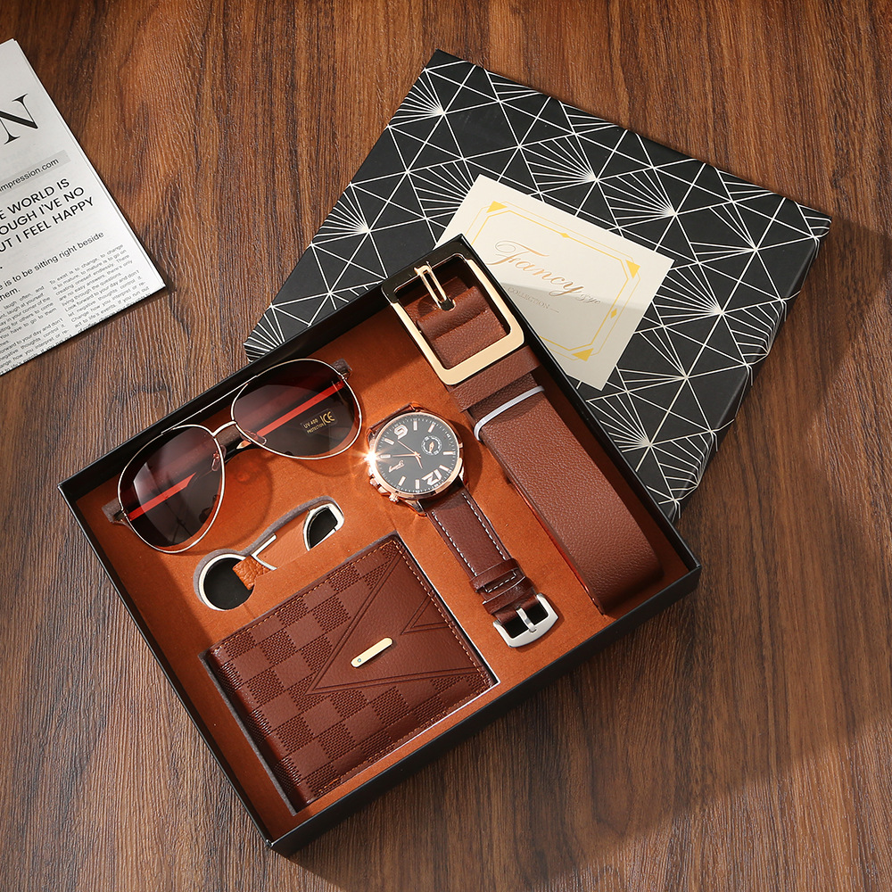 Coffee-colored # 6-piece set: Watch + Belt + wallet + sunglasses + keychain + exquisite gift box