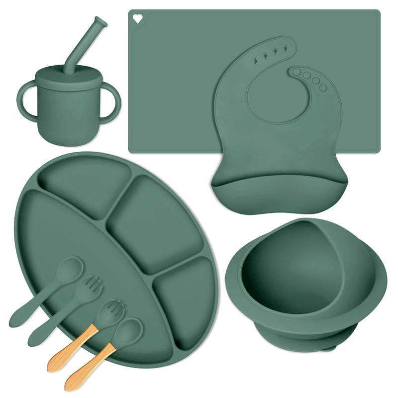 Amazon's best-selling baby silicone four-compartment plate, oval baby tableware set, children's complementary food bowl, fork, spoon and bib