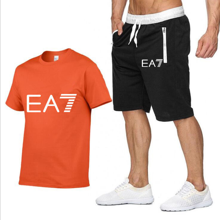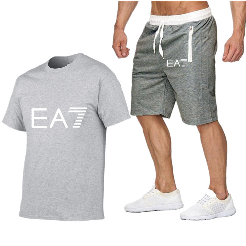 Amazon sportswear set, European and American trendy brand EA7 printed round-neck short-sleeved men's casual short-sleeved T-shirt + capri pants