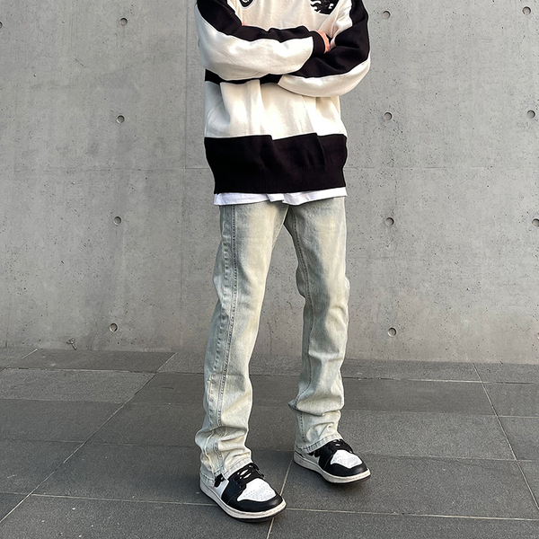 American high street yellow mud-dyed washed distressed jeans, men's ins trendy brand slimming straight-leg slightly flared flared slimming long pants