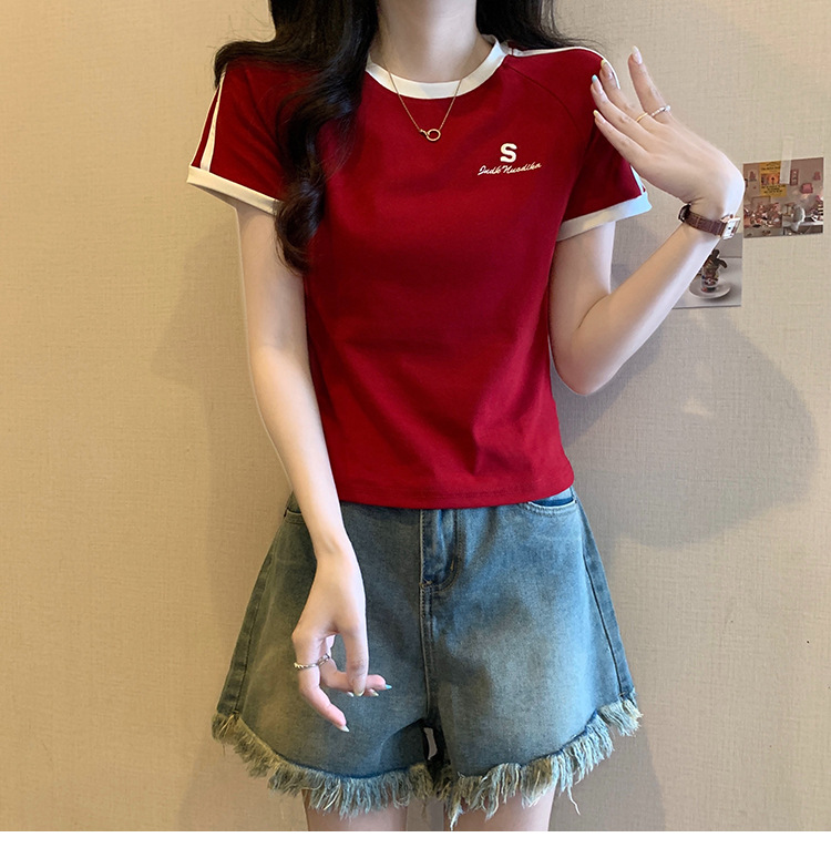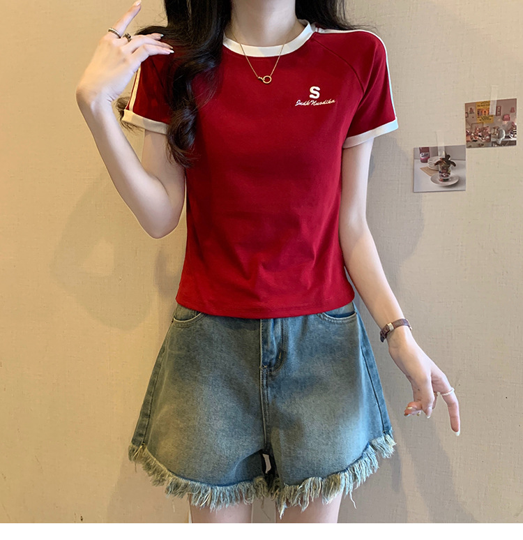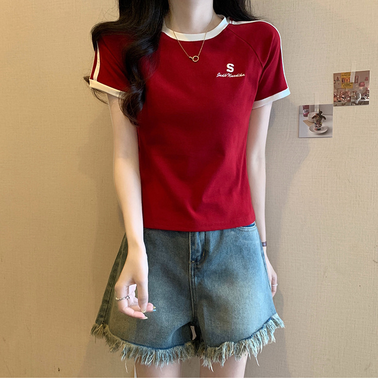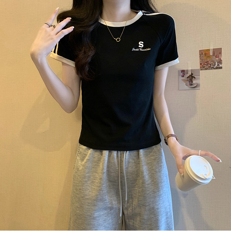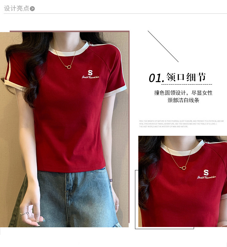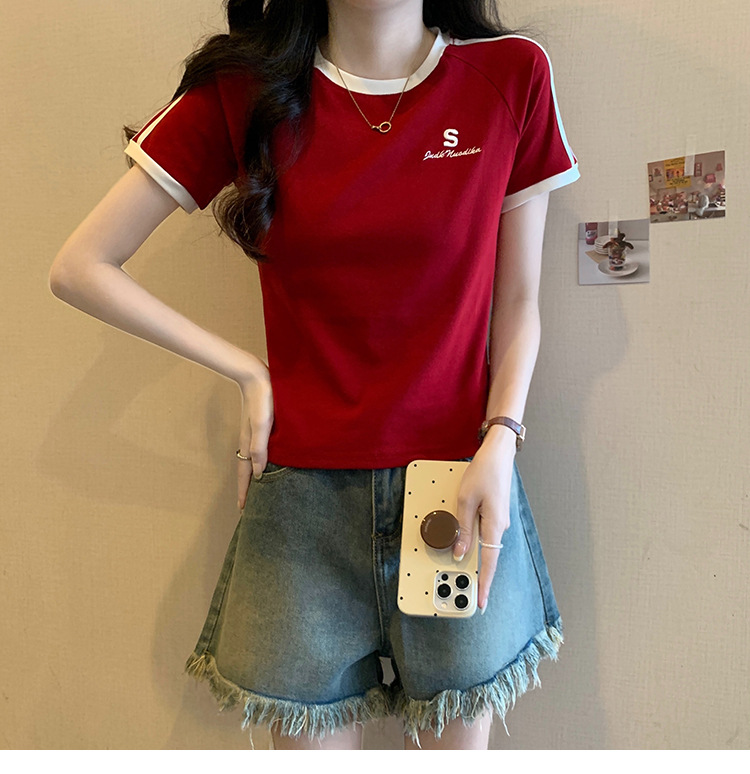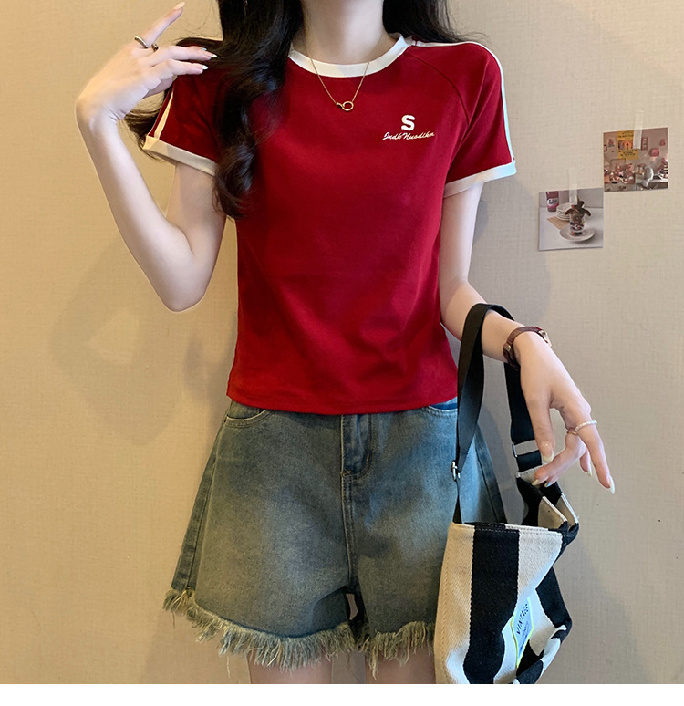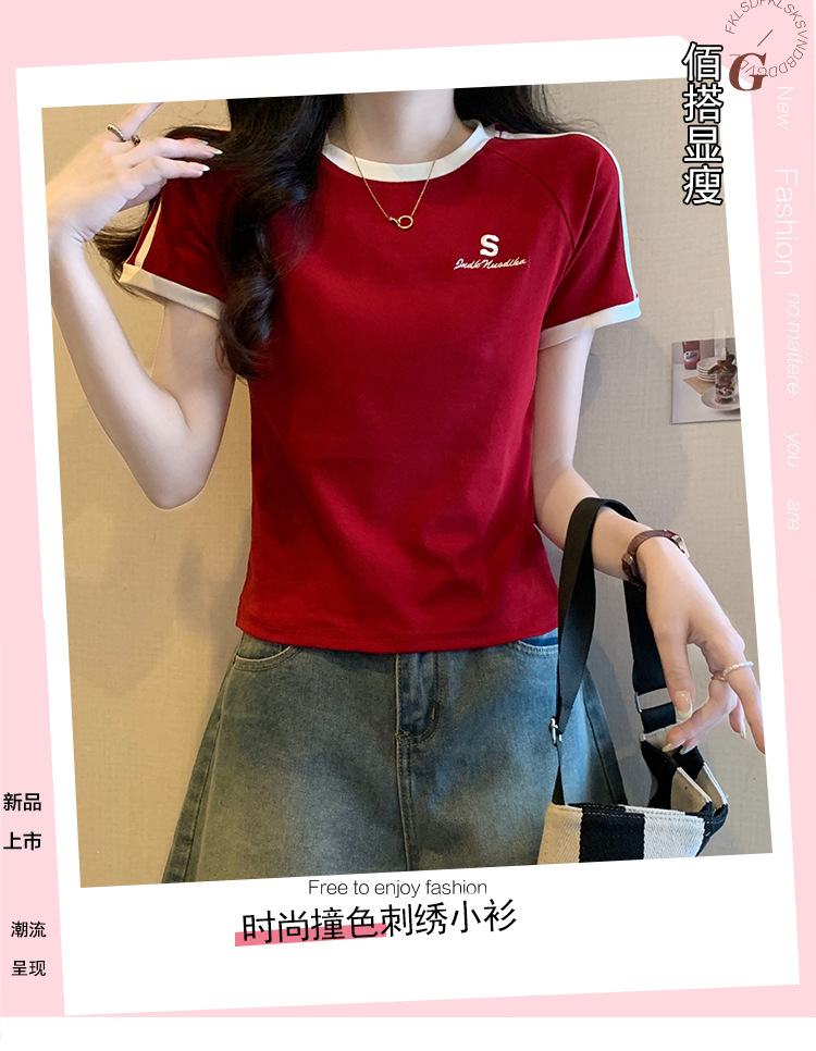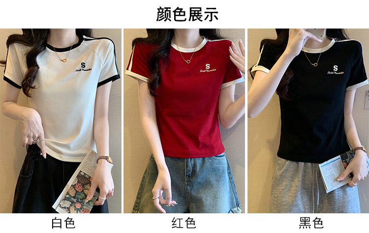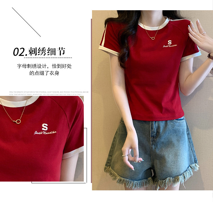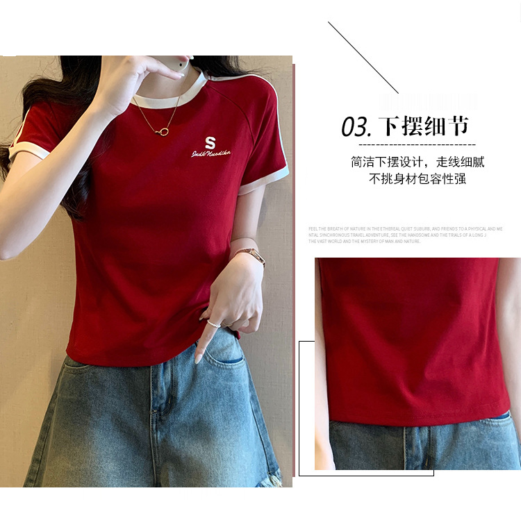American shoulder-length round-neck short-sleeved T-shirt women's 2024 summer new style, a slimming and figure-hugging short T-shirt top for hot girls