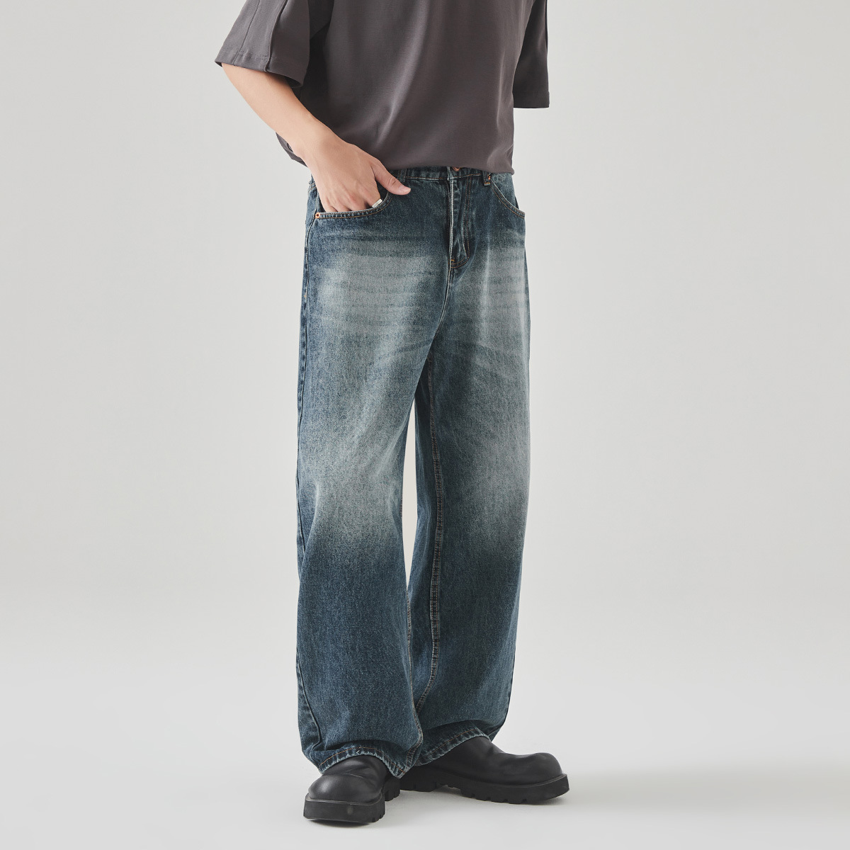 APO Men's Wear: American high street retro pure cotton men's jeans with a trendy design sense, loose straight-leg casual trousers