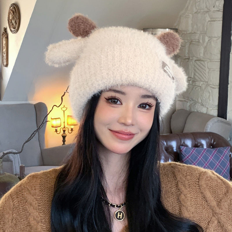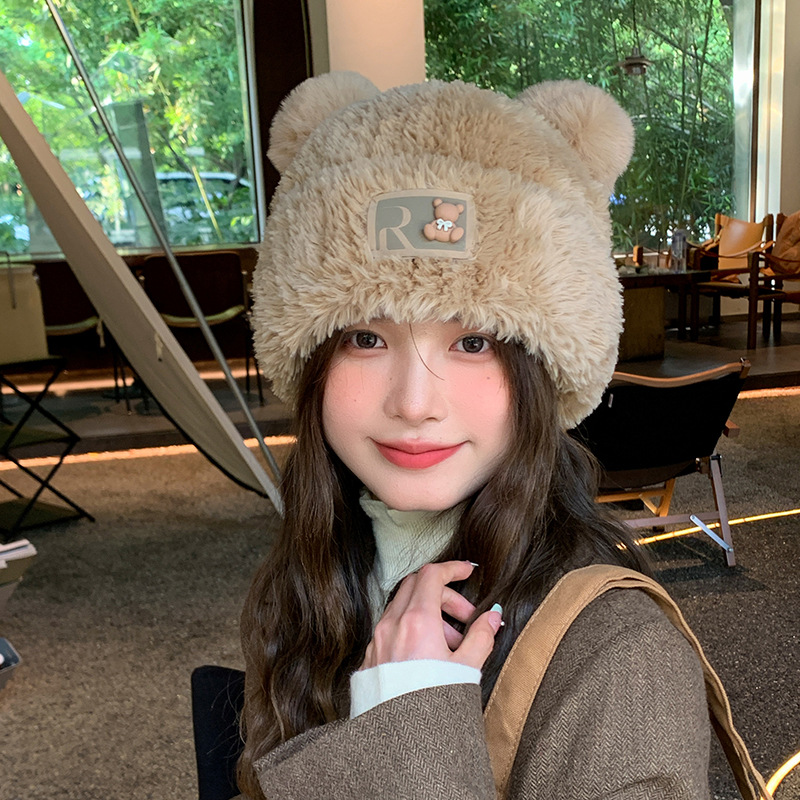 Autumn and winter Japanese-style cute bear woolen knitted hat, women's outdoor plush warm ear-protecting hat, cartoon bear hat