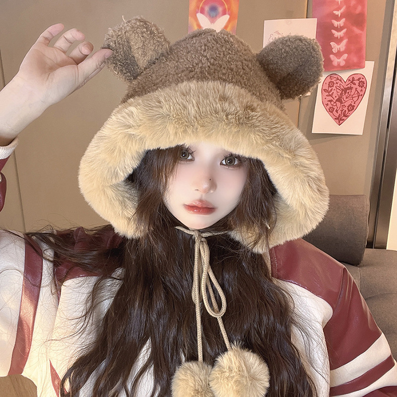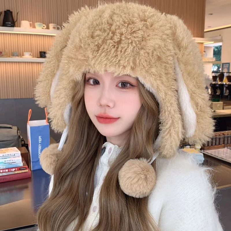 The new cute large-eared velvet hat for girls in autumn and winter is a plush ear-protecting hat with cartoon soft and adorable fur balls made of soft fabric