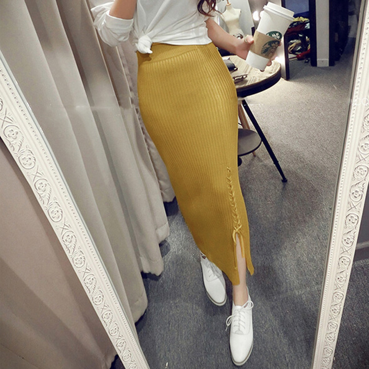 Autumn and winter new Korean-style lace-up slit high-waisted knitted body-hugging long skirt, one-step skirt, woolen skirt