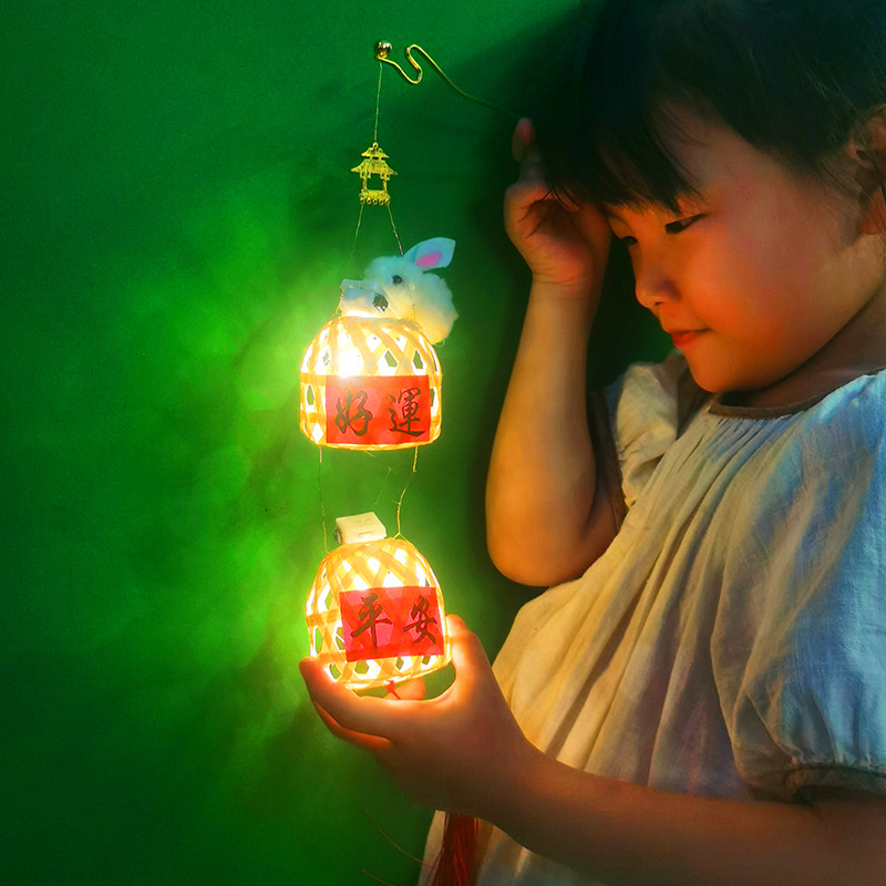 (Mixed characters) Golden pole + Golden House, 9cm bamboo woven round lantern, 1 string