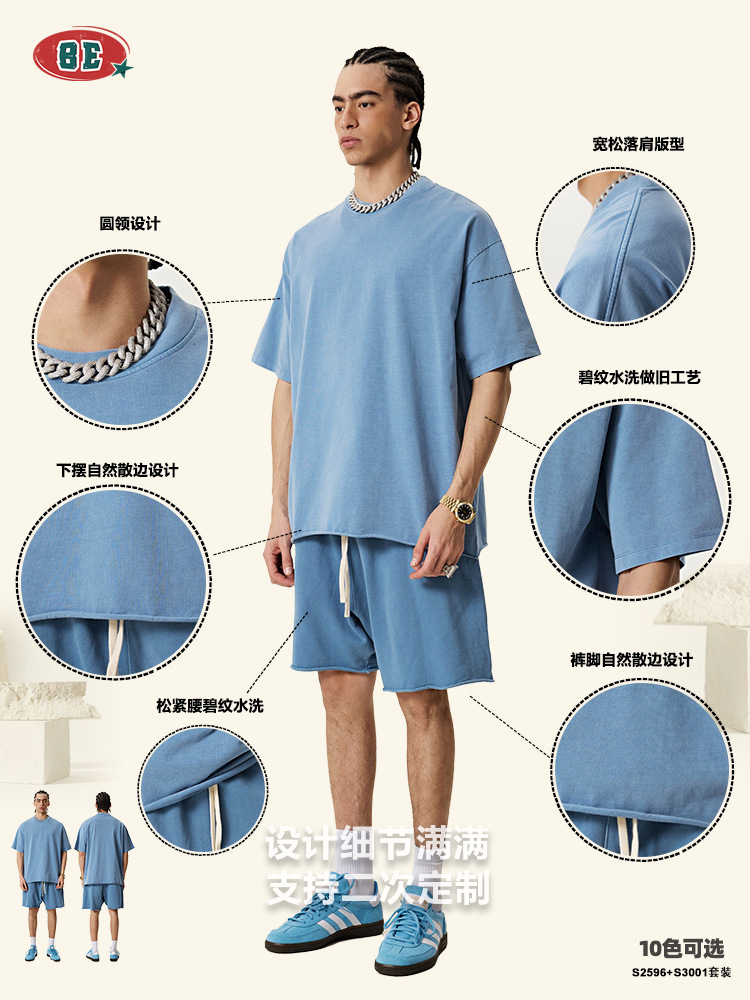 BE Men's Wear: 2025 Summer American streetwear brand's heavyweight, wide-sized men's short-sleeved T-shirt and shorts set with loose edges and blue patterns