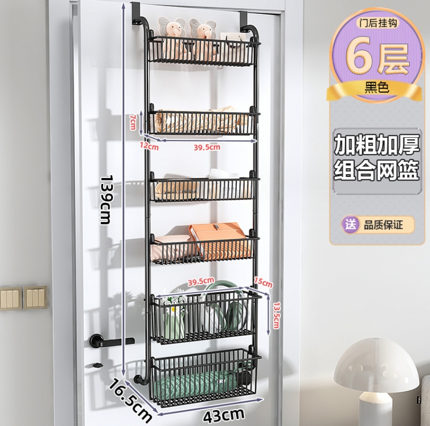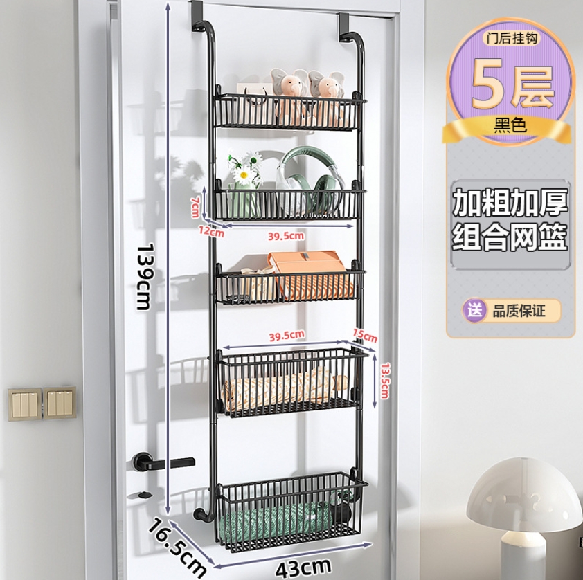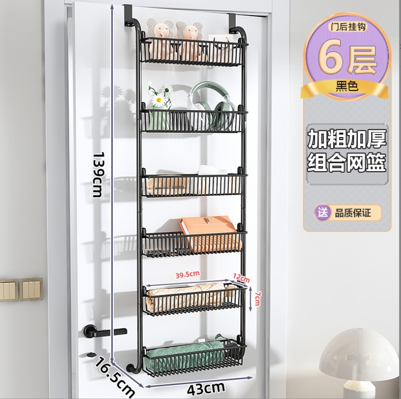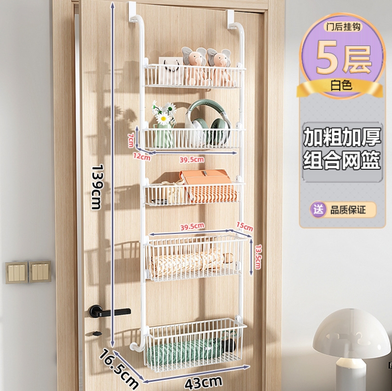 Behind the door, there is a hanging basket storage rack without drilling holes. It is used for storing sundries in bedrooms, bathrooms, and kitchens