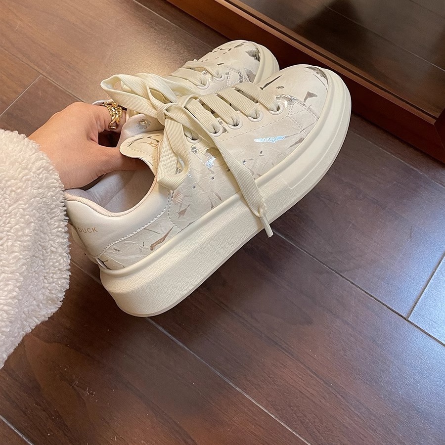 Benta ~ Shiny thick-soled height-increasing versatile white sneakers for women's casual single shoes 2024 Spring and Autumn New lace-up sports shoes