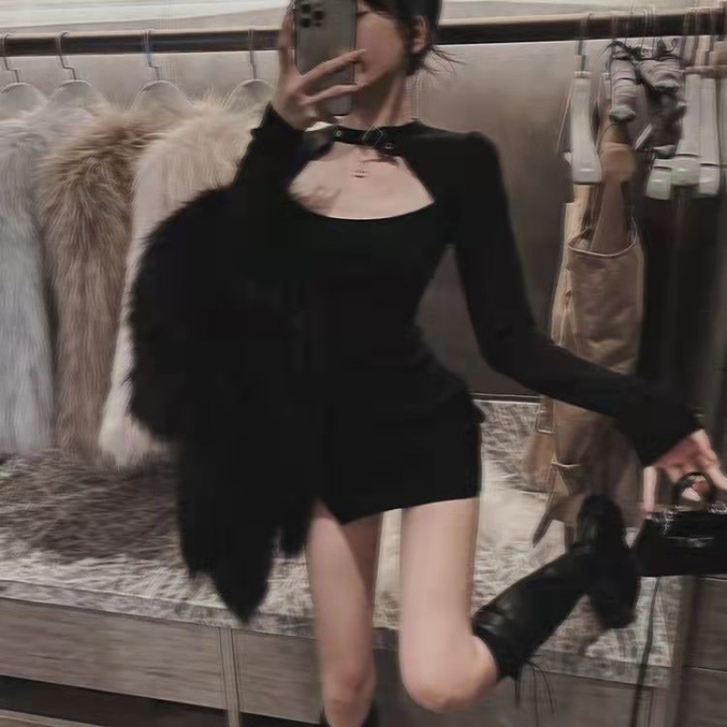 Black halter-neck, form-fitting and elegant dress for women in autumn. Petite, sexy and hot girl. Long-sleeved, waist-cinching, slit and hip-hugging dress
