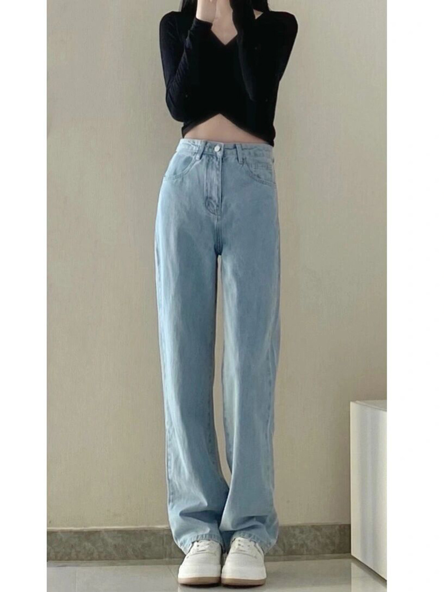 Black high-waisted straight-leg jeans for women's Spring and Autumn 2025 new style, highlighting a petite figure, drooping wide-leg floor-length pants