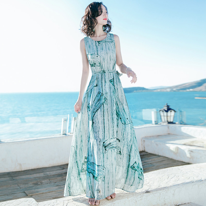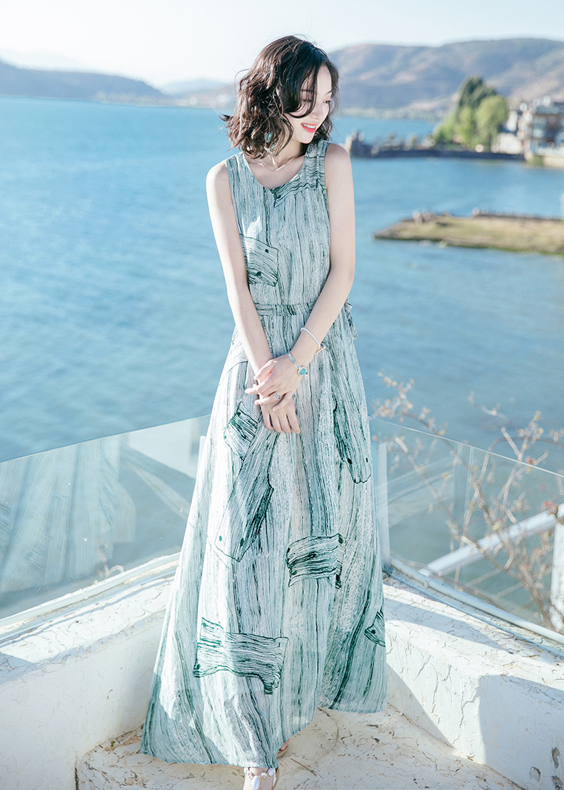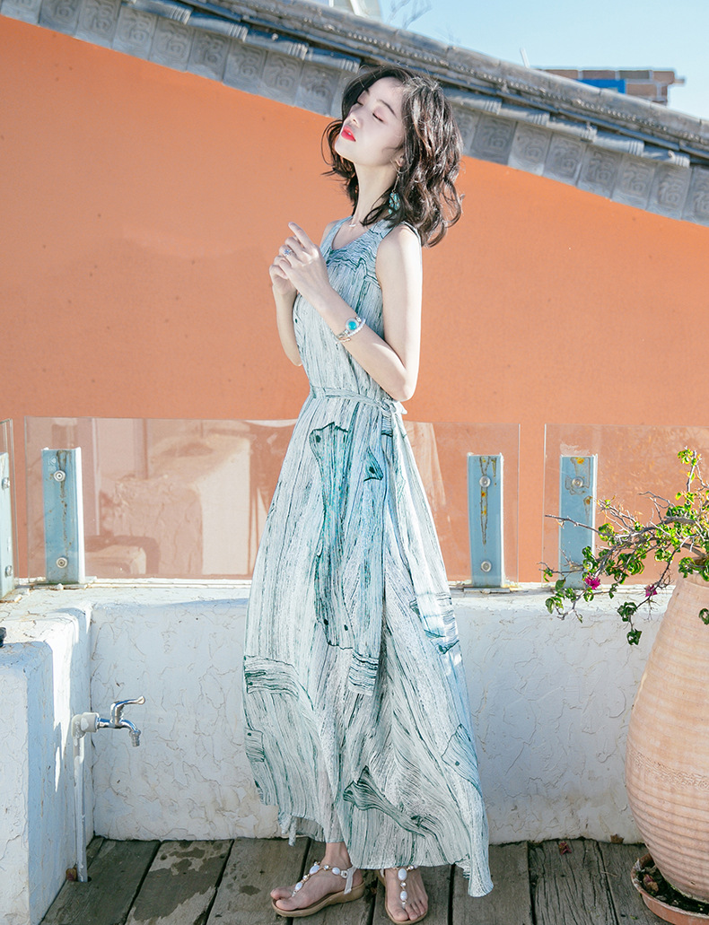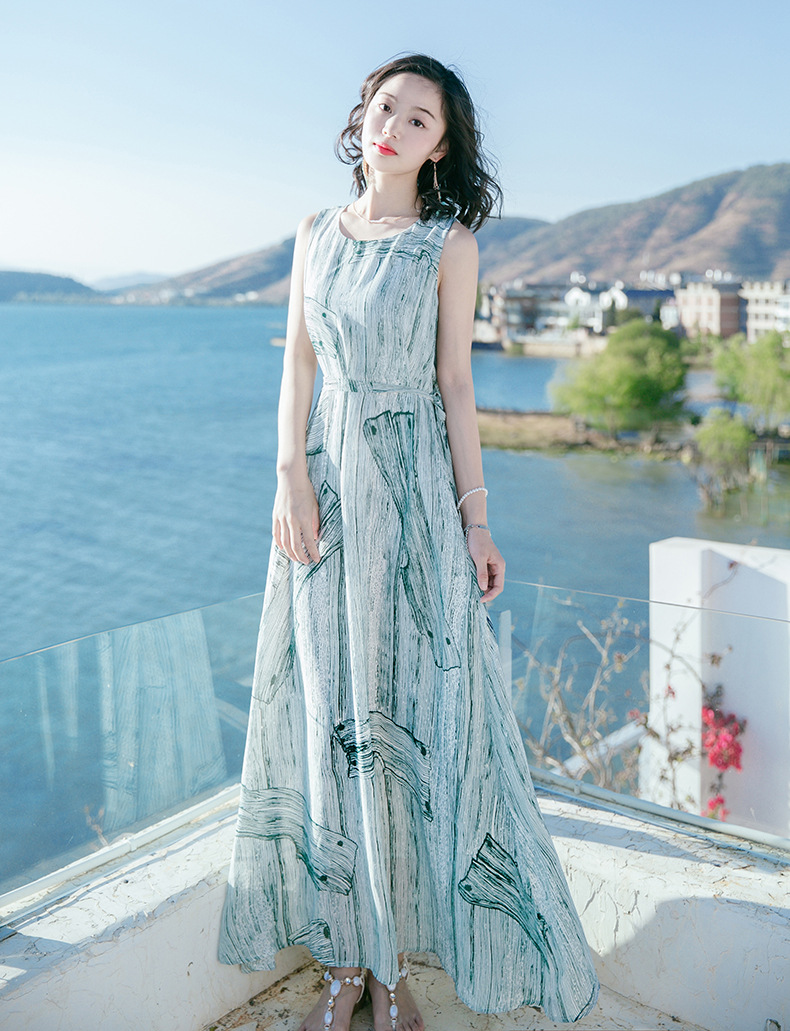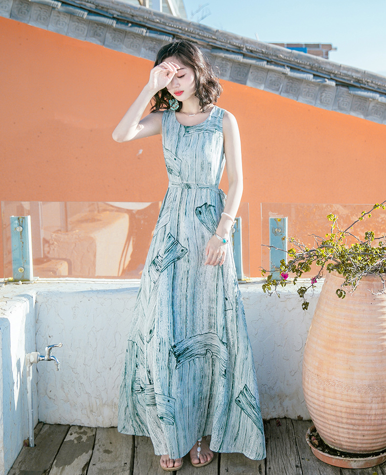 Bohemian dress Summer new women's wear waist-cinching and slimming dress Long dress printed beach dress seaside vacation