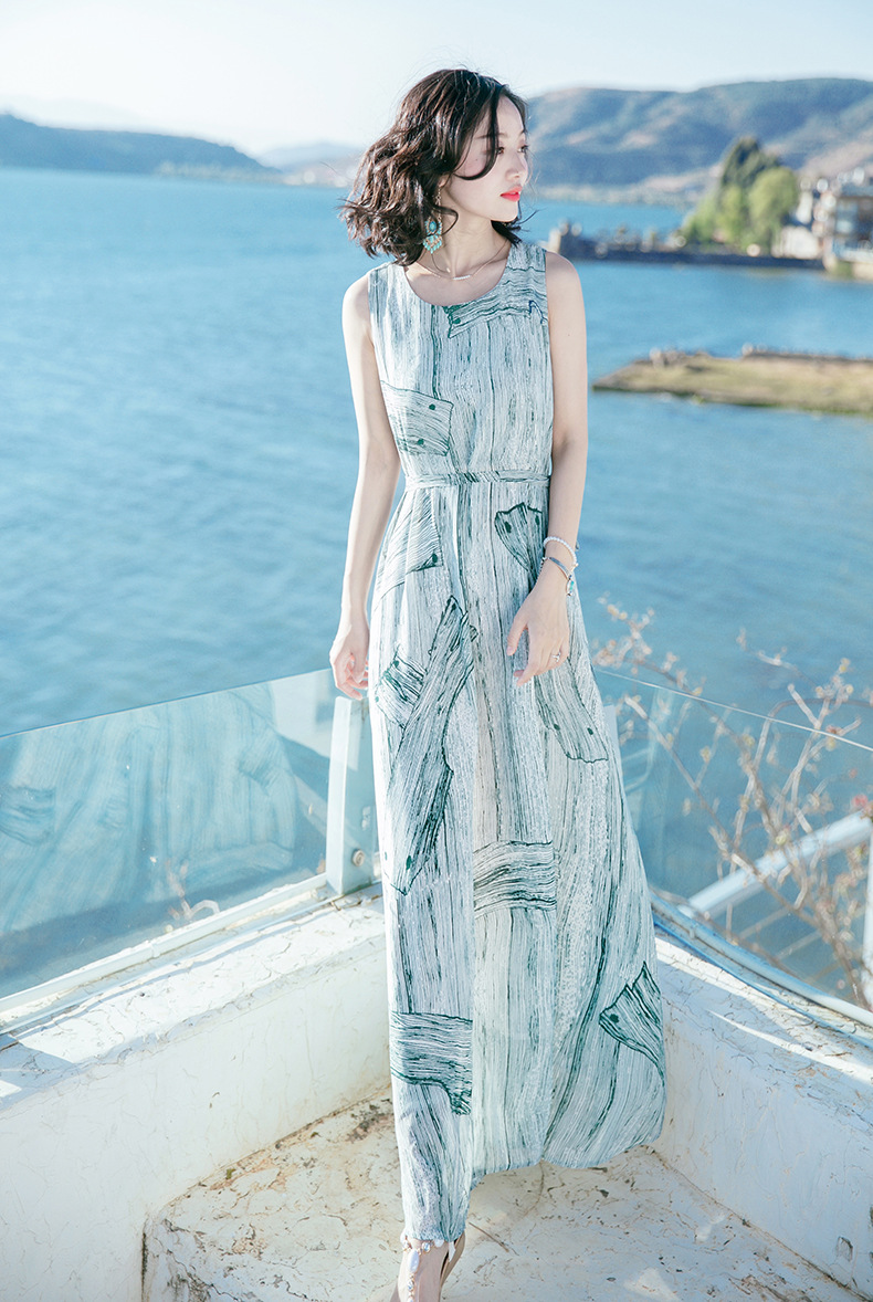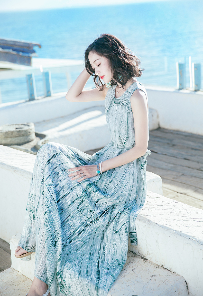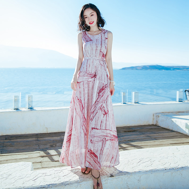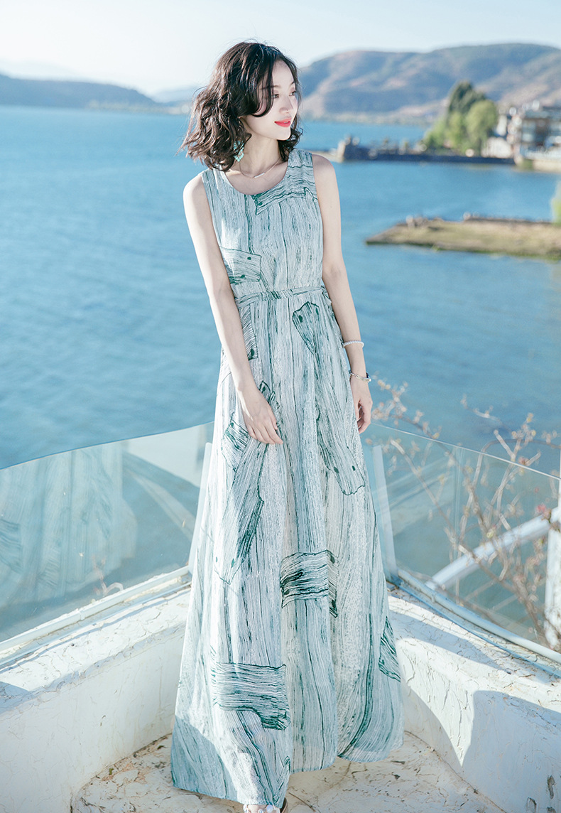 Bohemian dress Summer new women's wear waist-cinching and slimming dress Long dress printed beach dress seaside vacation