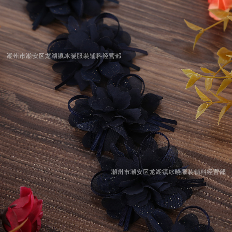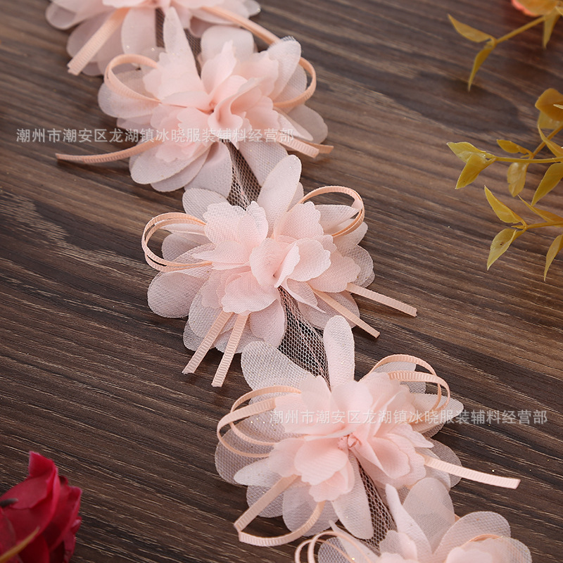 Bow ribbon flower, 8 leaves, 8cm, 120D chiffon with gold-sprayed mesh, hand-woven lace