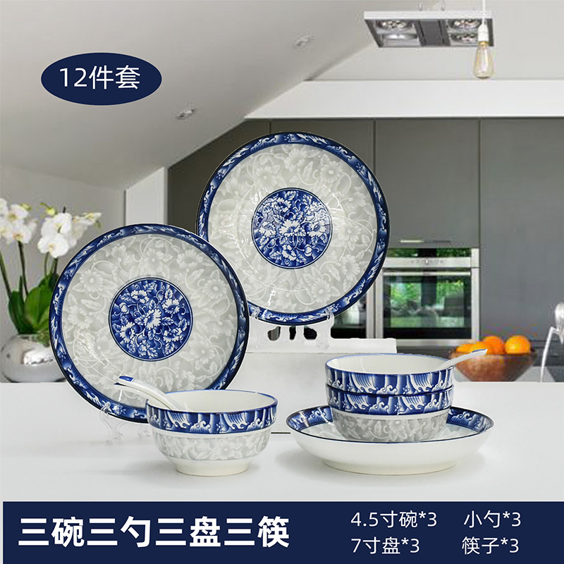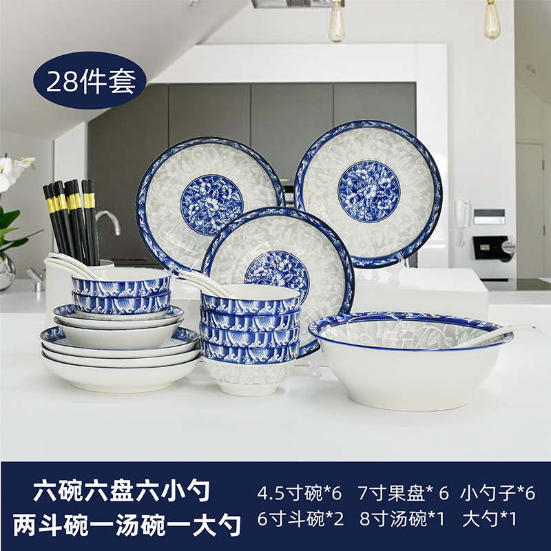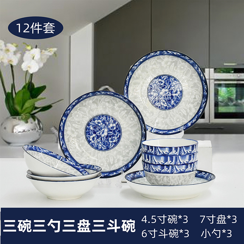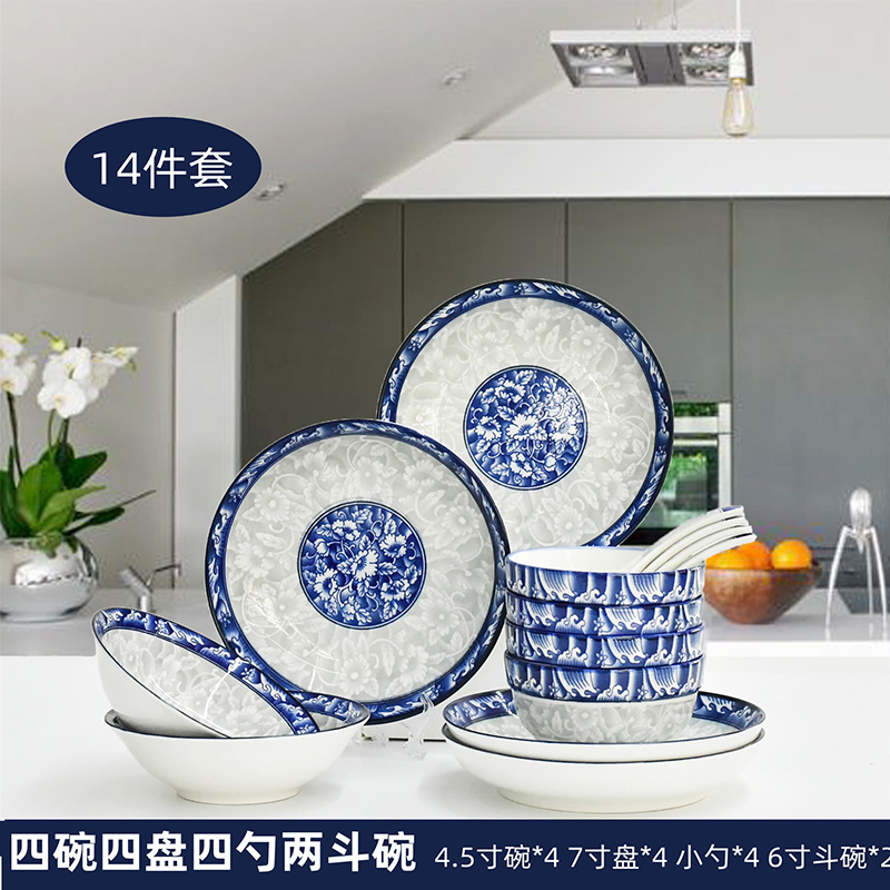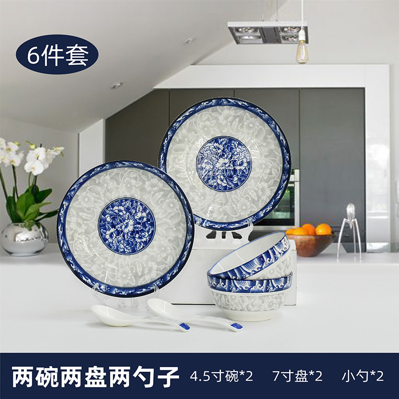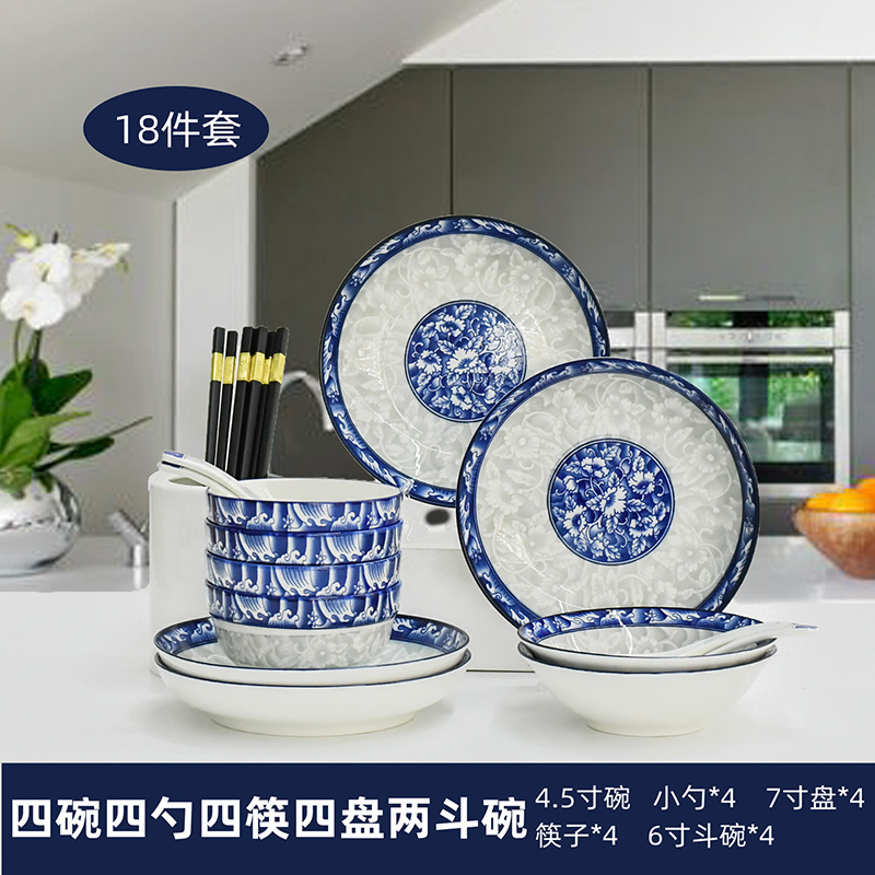 Bowl and plate set: Household tableware, Chinese underglaze color bowl and plate ceramic complete set, blue and white porcelain bowl, blue and white plate and plate combination