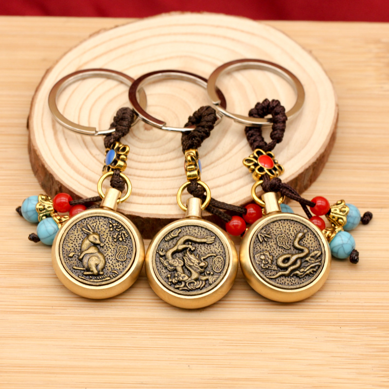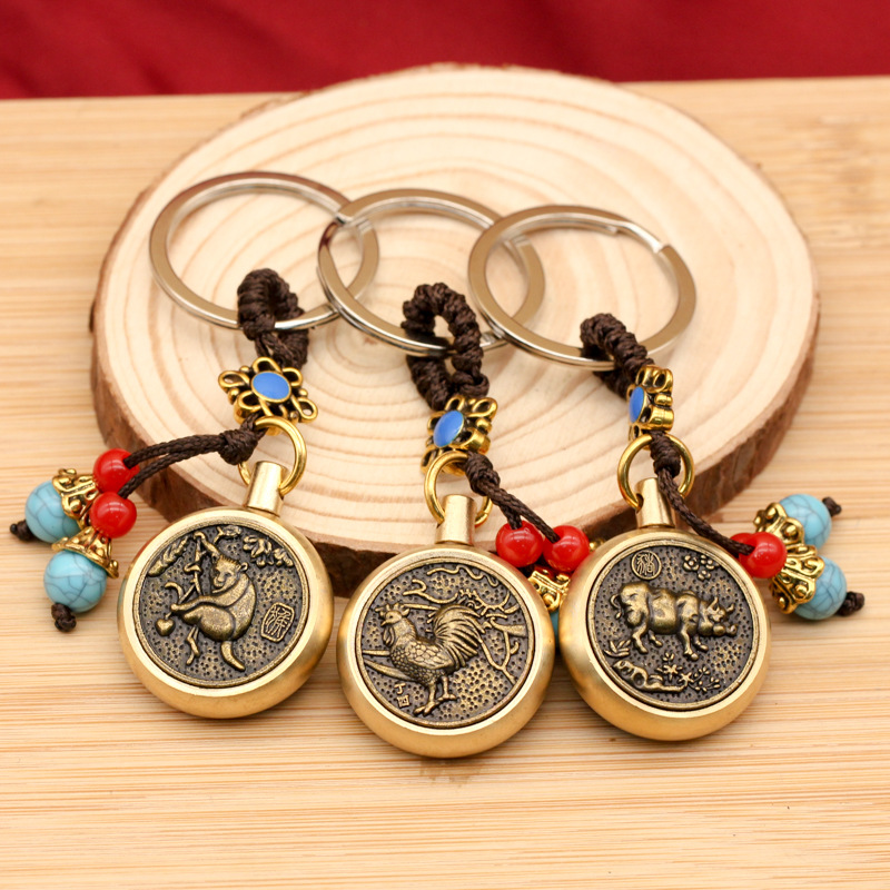 Brass vintage blue bead rope, Chinese zodiac rotating creative keychain accessories, small gifts, car pendants wholesale
