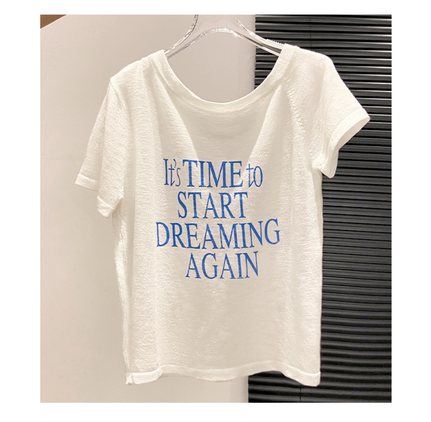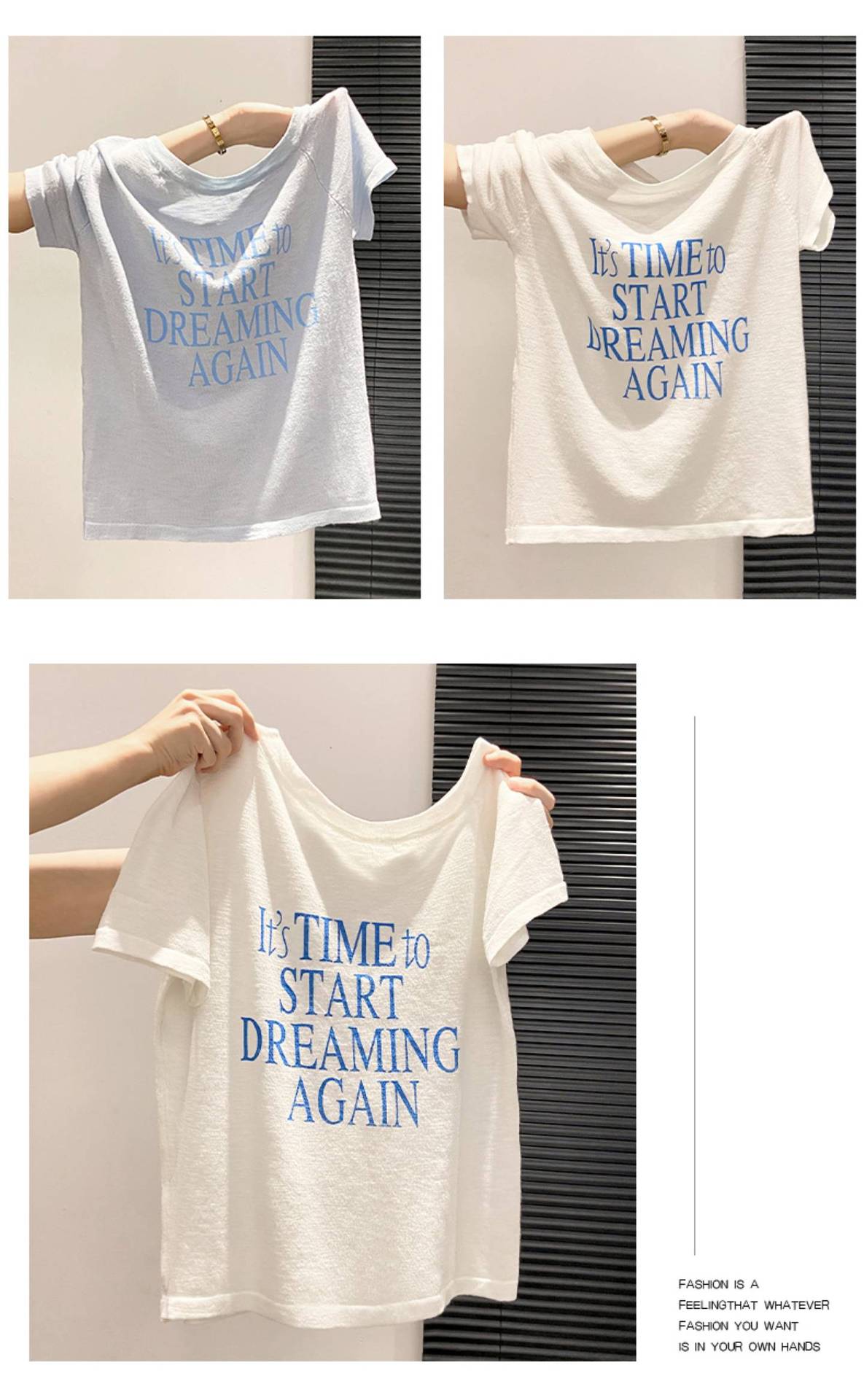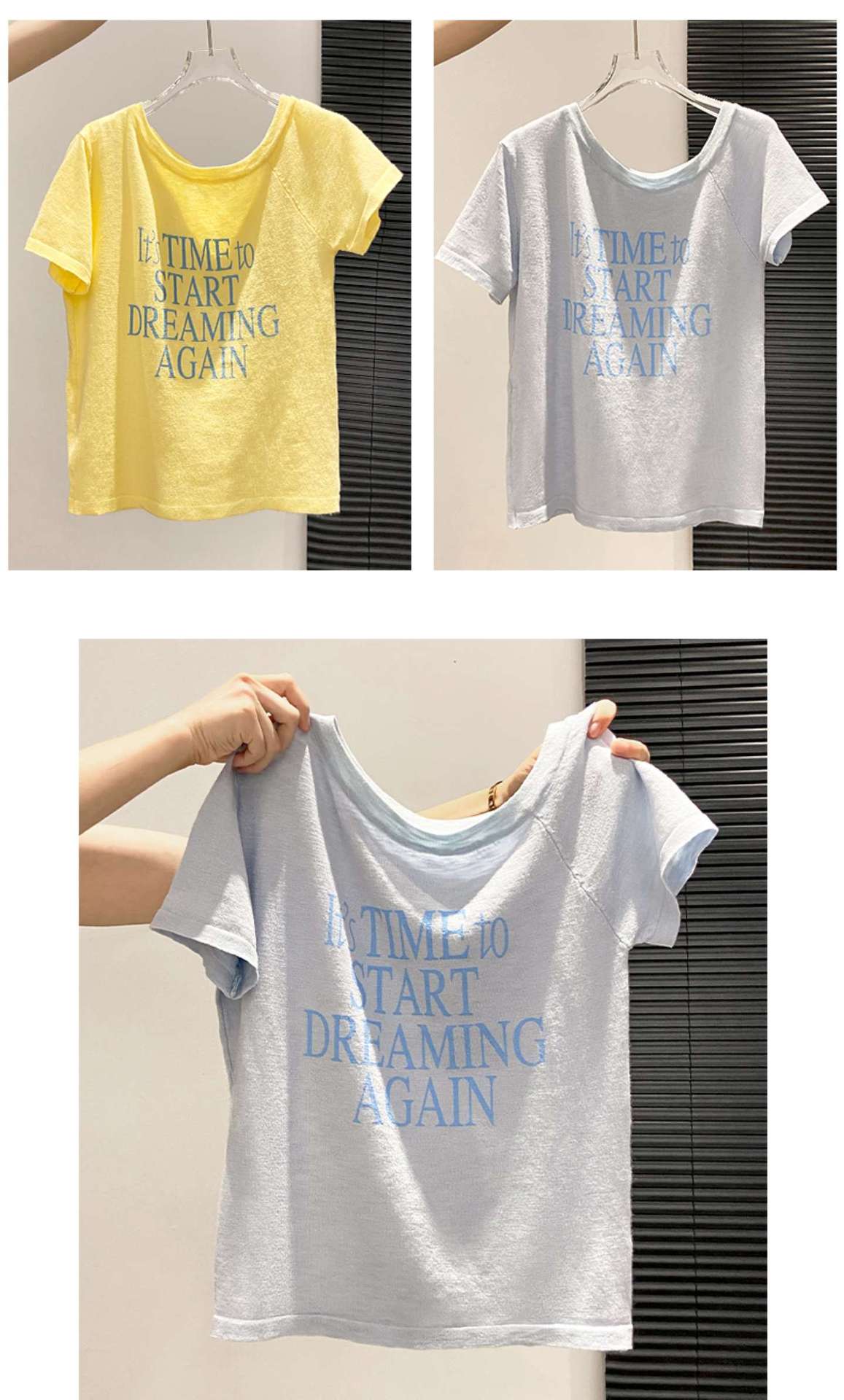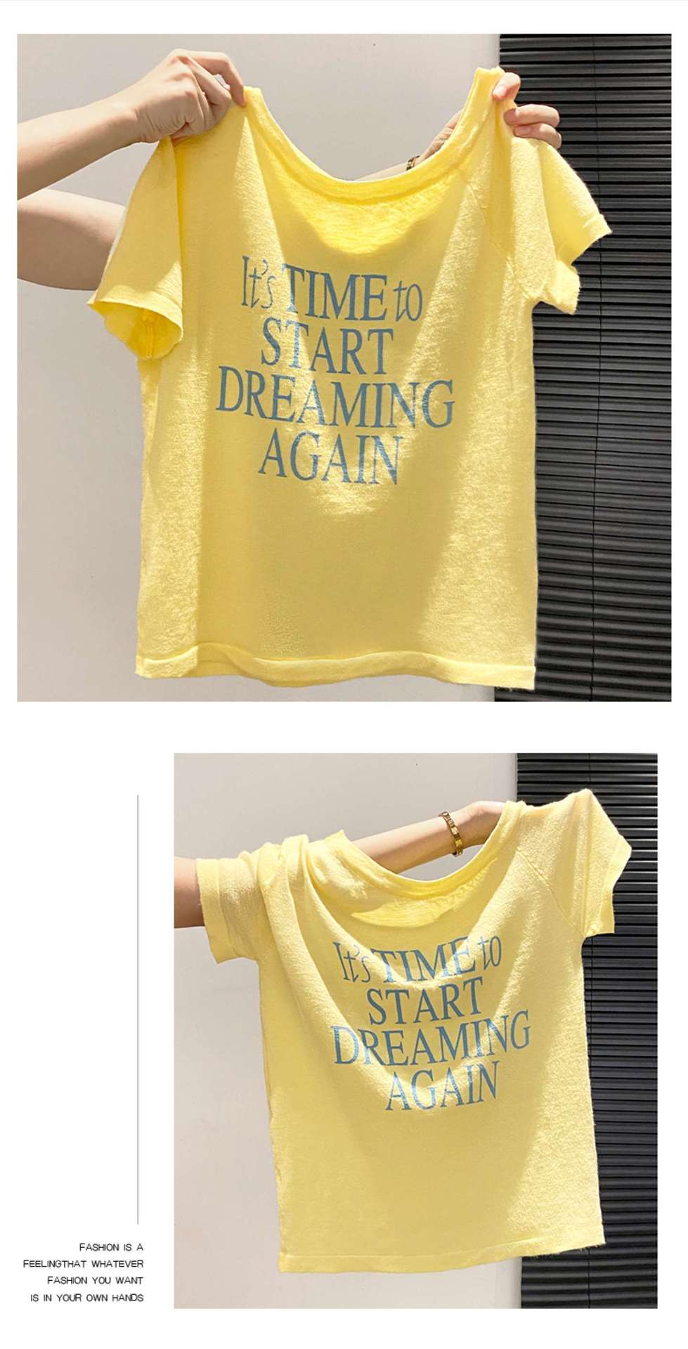 Bright yellow short-sleeved women's one-shoulder slant-neck T-shirt, a loose, casual and laid-back chic off-the-shoulder top for summer