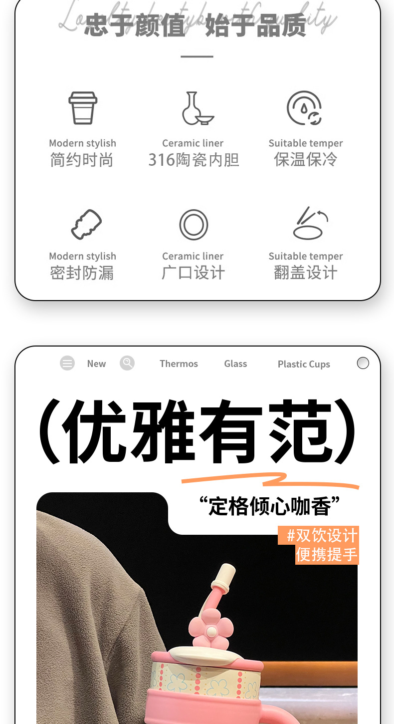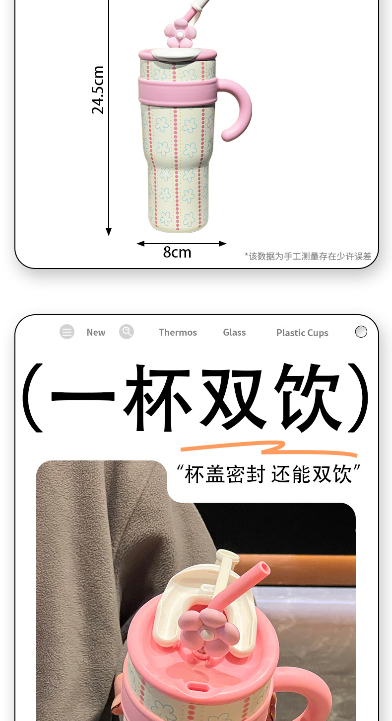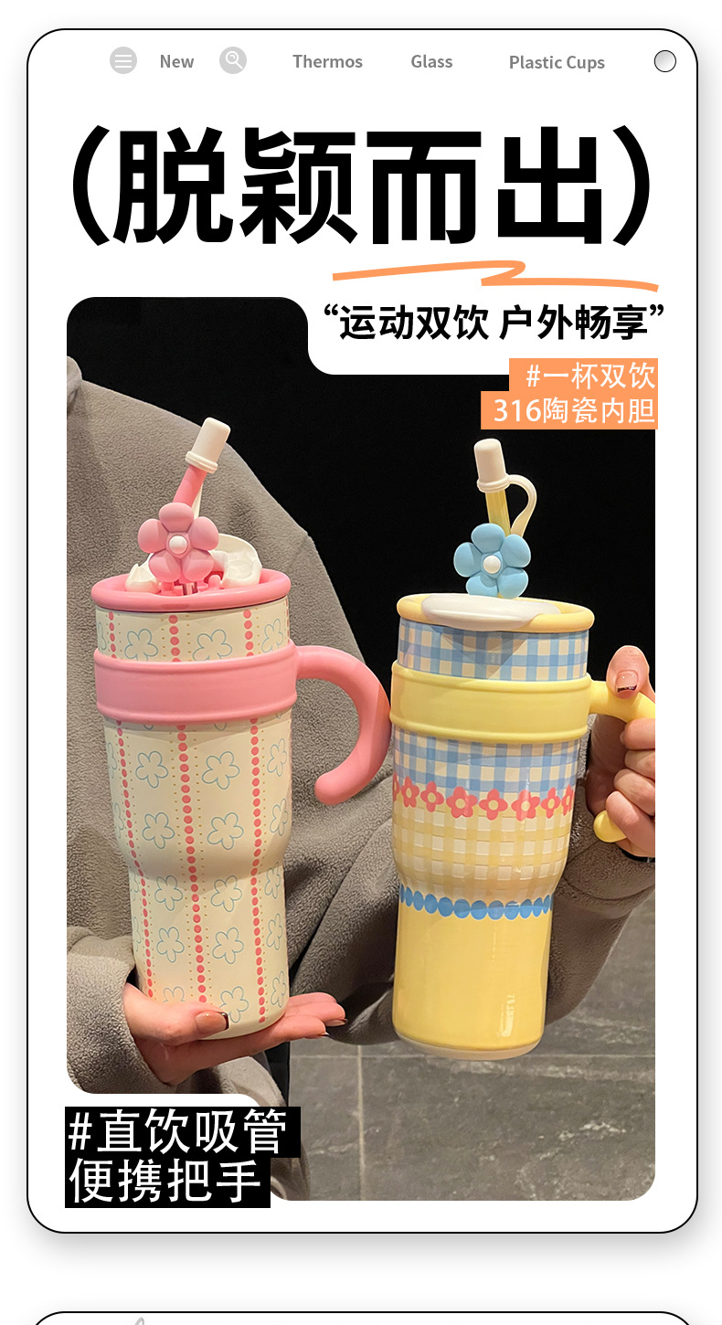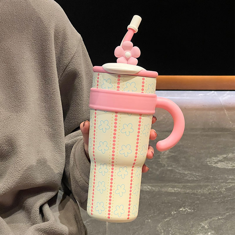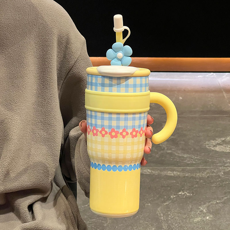Ceramic inner liner insulated cup, giant handle ice cup, double-drinking straw water cup, large-capacity women's cup with high appearance level