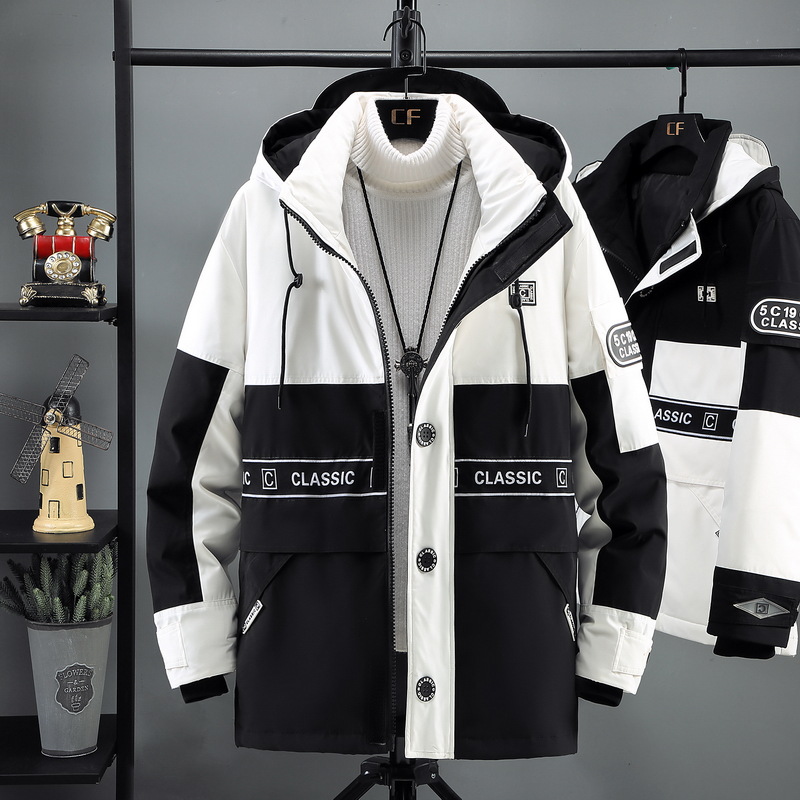 Chanel-style down jackets, color-blocked workwear for couples, men and women in contrasting colors, mid-length thickened hooded loose cold-proof jackets