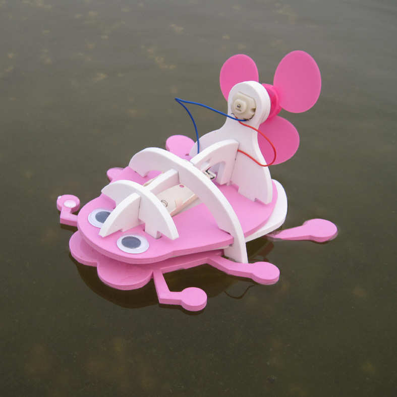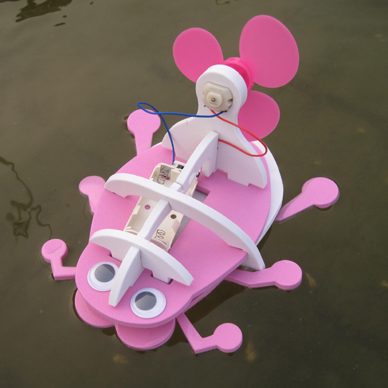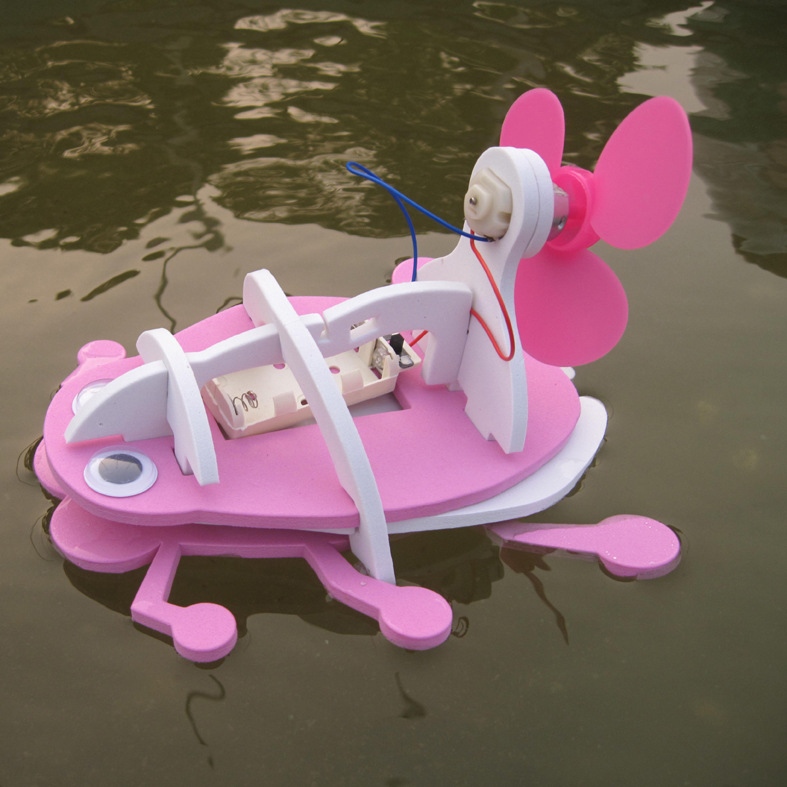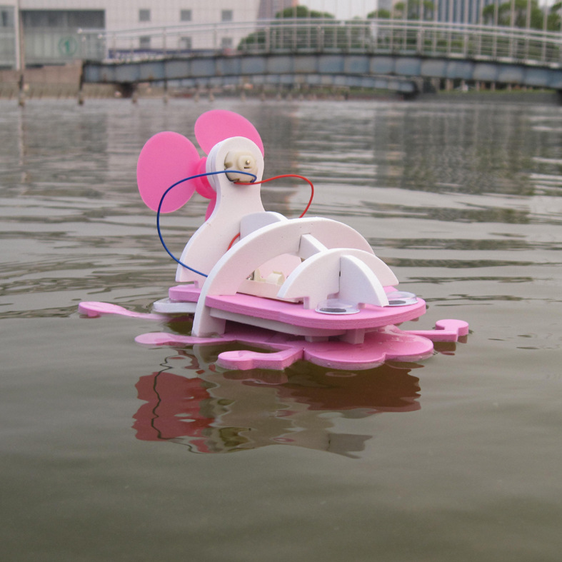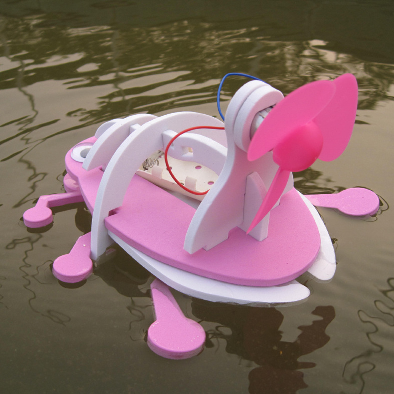 The principle of converting electrical energy into mechanical energy is that the motor drives the fan blades to rotate, generating air to push the small boat forward.