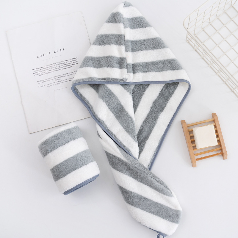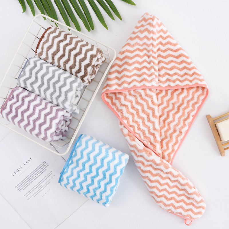 【 Chi Jia 】 Striped printed dry hair cap, dry hair towel, bathroom coral fleece absorbent towel, bath towel with buttons