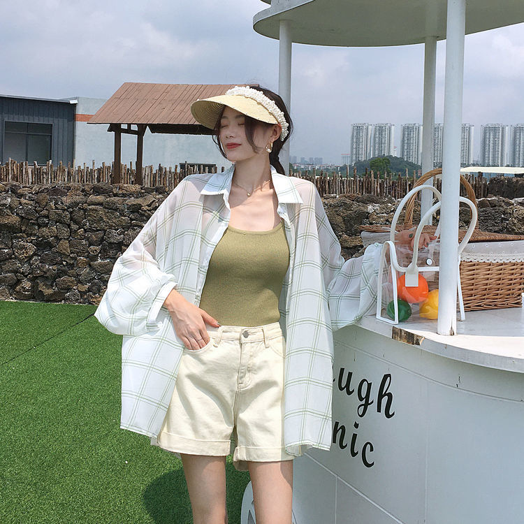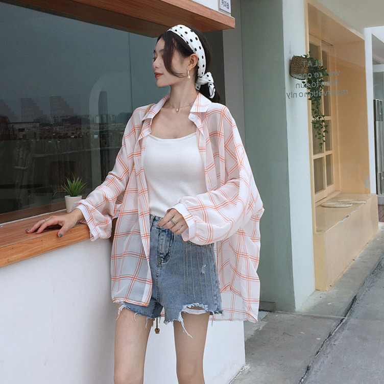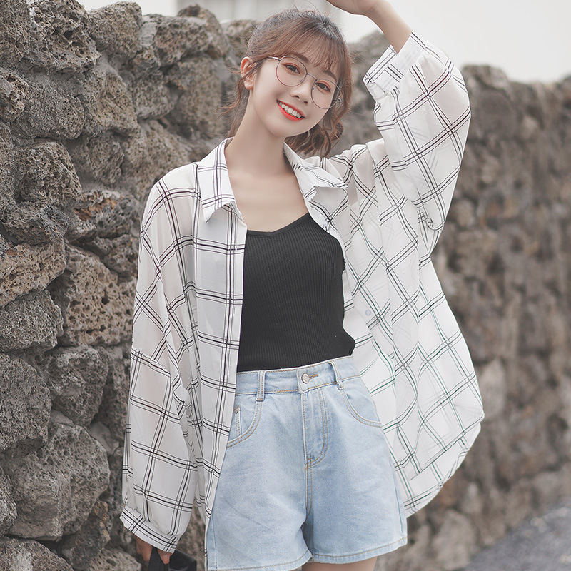 Chiffon checkered sun-protective shirt for women, a new summer 2021 design style, a niche shirt with puffed sleeves