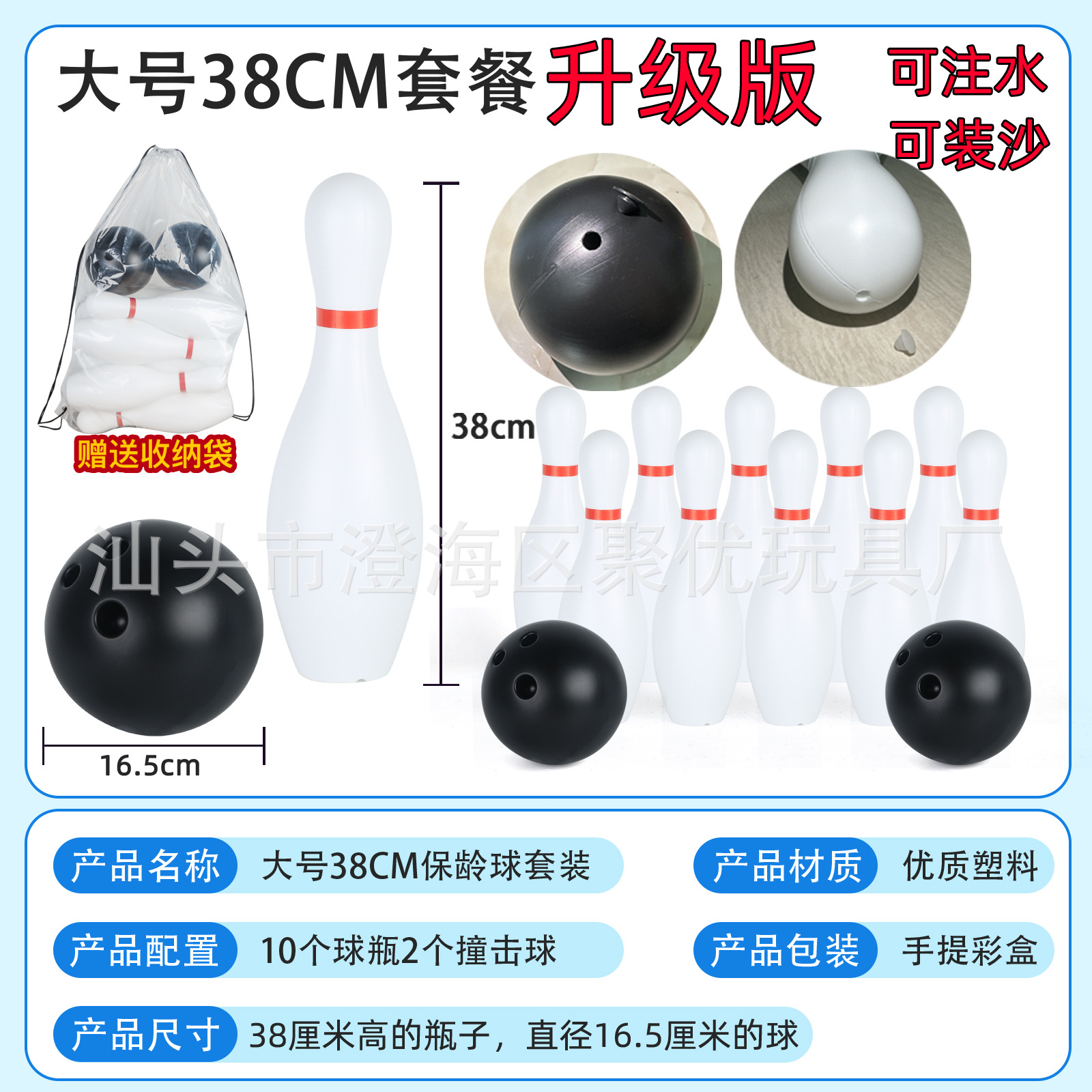 New product 38CM: The bottle height is 38cm, the maximum diameter of the bottle body is 12cm, the diameter of the impact ball is 16.5cm, and the weight of each bottle/ball is approximately 135 grams