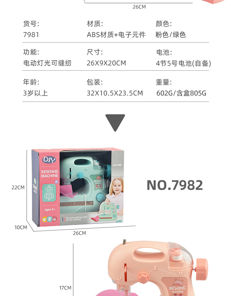 | 7982A/B Medium-sized Electric Light Sewing Machine (Pink/Green) | 48PCS | 87 * 54.5 * 69 cm | 28/25KG |