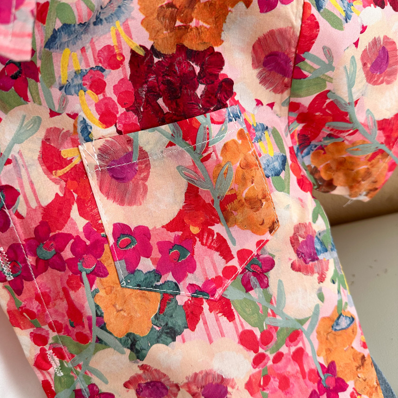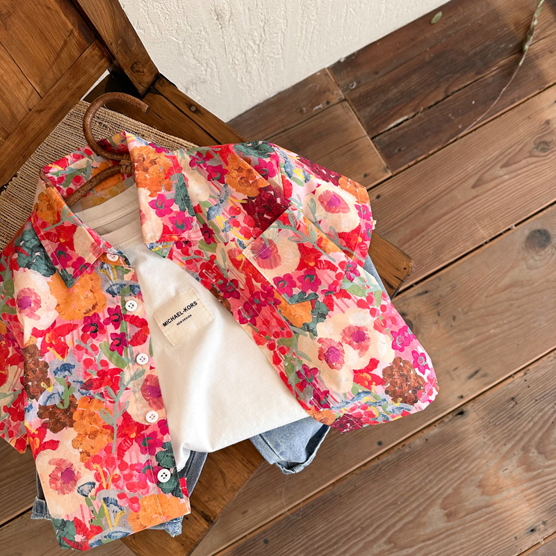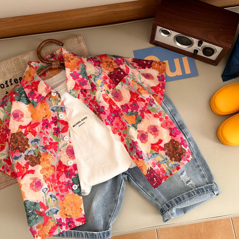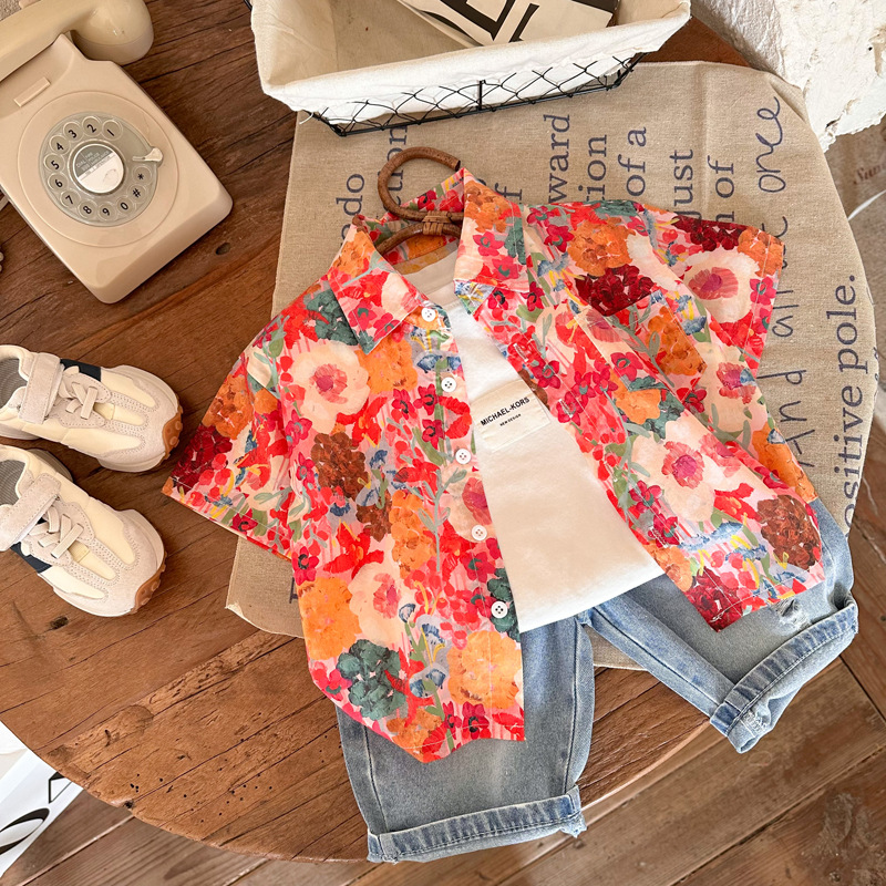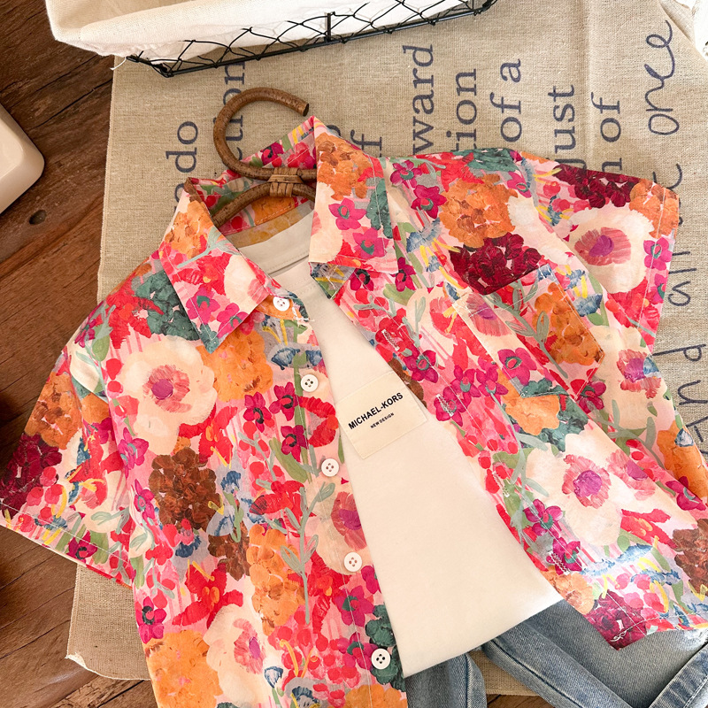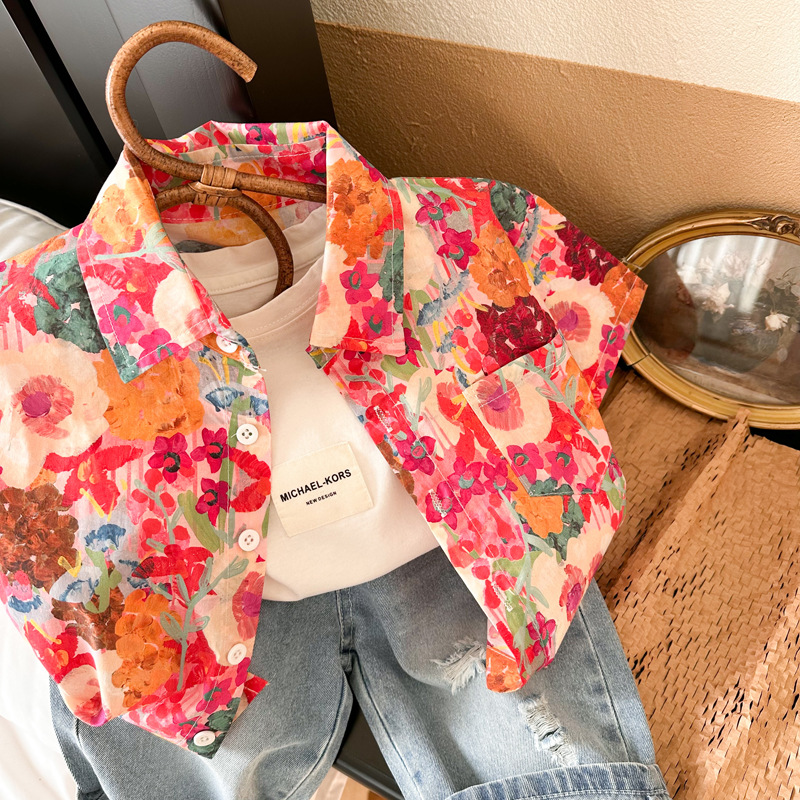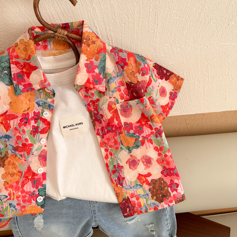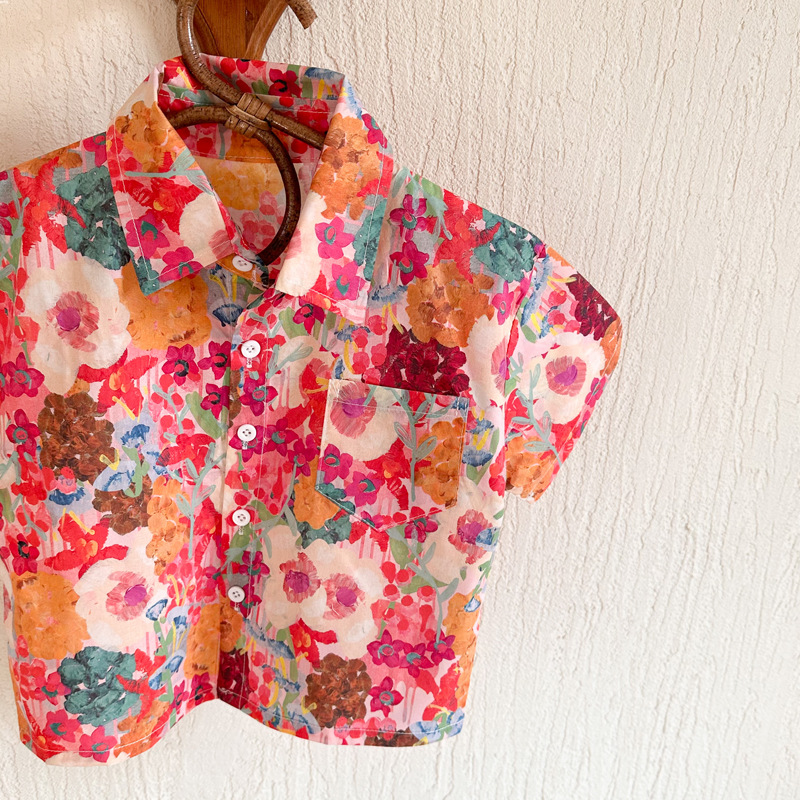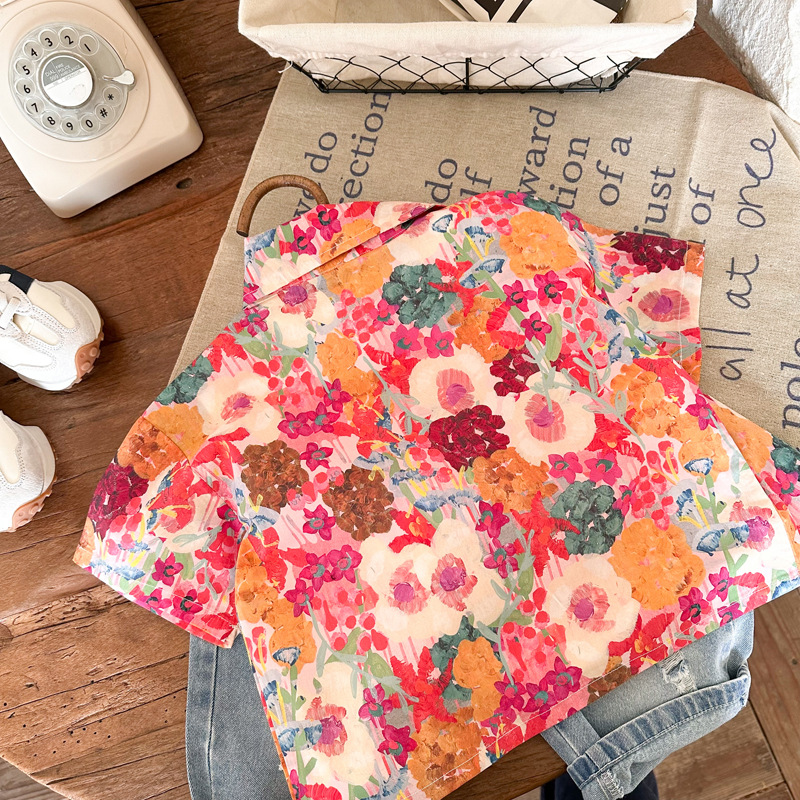 Children's floral shirts 2023 Summer New styles for boys and girls, retro Hong Kong-style short-sleeved shirts, and printed shirts for children and babies