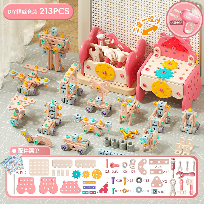Hippopotamus and Xiaobei Tool Table +DIY 2-in-1 with 213 pieces of Electric Drill [Pink]