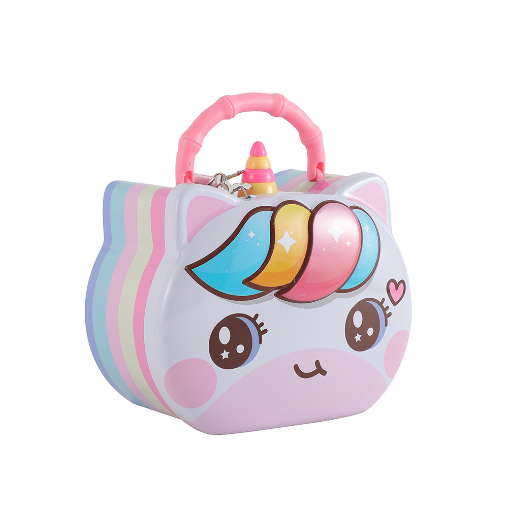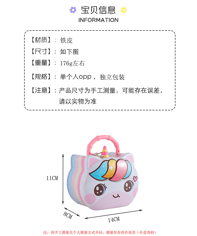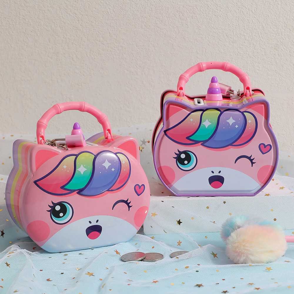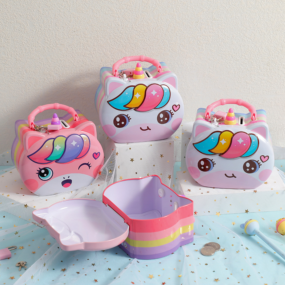 Children's iron unicorn savings box, cartoon hand-held locked piggy bank, small gift tin box for kindergarten activities
