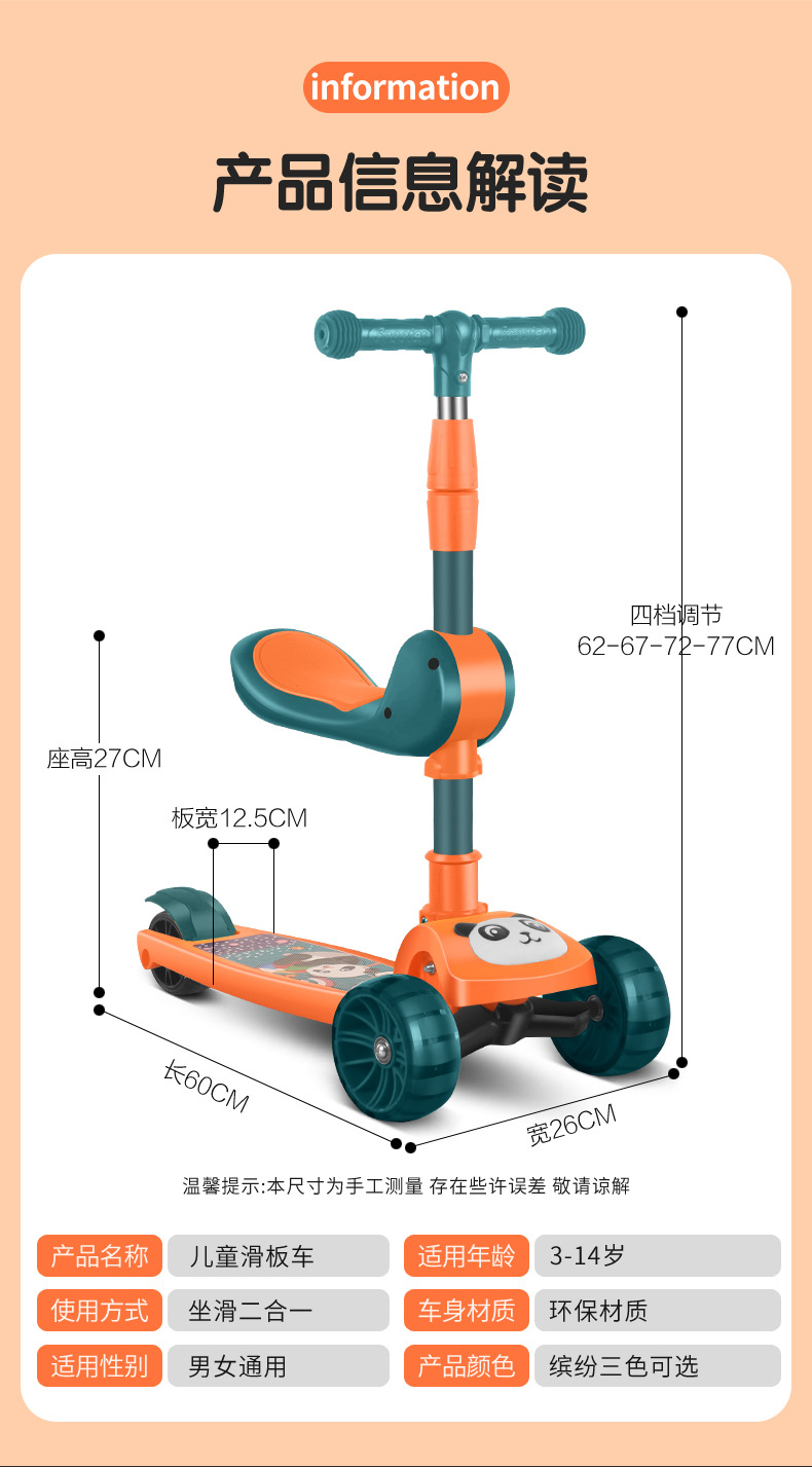 The 2023 model of "Children's Scooter Made of Eco-friendly Materials, safe and odorless production, can be purchased with Confidence" is suitable for babies aged 1.5 to 12. The meter-high scooter can be folded with one button for easy travel and carrying! You can choose the handlebars with children's songs and colorful lights and seats. The height of the handlebars can be adjusted in three Settings. "We promise it can carry 80 pounds without any problem." "No installation required upon receipt, you can play directly." "Factory wholesale price without free shipping." "One vehicle can be purchased. For inquiries about express delivery and logistics, please consult the online customer service. Individually packaged and shipped one by one." "Full box, with seats, 9 vehicles in one box in bulk. There are 10 pieces in a box without seats. If you need individual packaging, please contact customer service. For large quantities, the freight can be picked up or paid on the spot by express logistics. For large quantities, please contact customer service to inquire about the freight. We offer one-piece consignment.