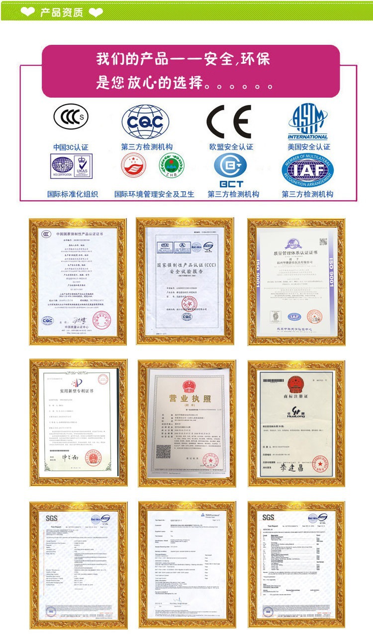 The company has obtained ISO9001:2008 quality Management System certification and occupational health and Safety Management System Certification. Its products have passed the American toy safety ASTME963-08 certification, the EU toy safety standard CE certification, and the national compulsory Product 3C certification, etc. It has also been awarded the title of "Yongjia County Famous Brand Trademark" certified enterprise. The company has been awarded the title of "A-level Contract-abiding and Creditworthy Enterprise" in Zhejiang Province. Its products are sold to major educational and early education institutions, kindergartens, schools, children's playgrounds, residential communities across the country, and are exported to Europe, America, Southeast Asia, North America and other countries and regions.