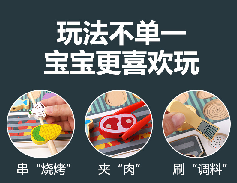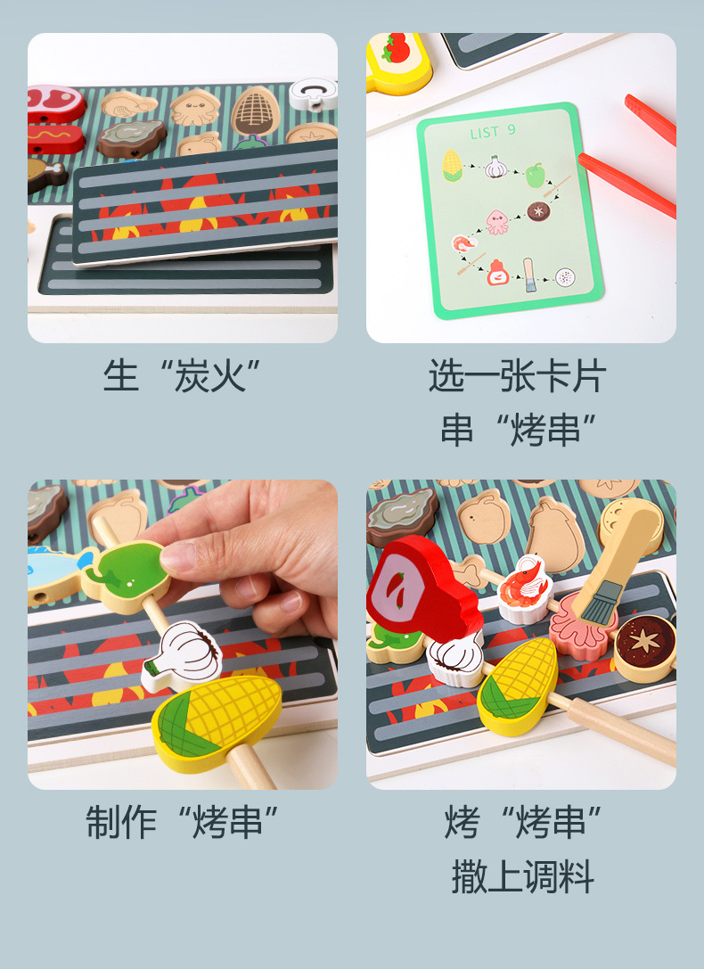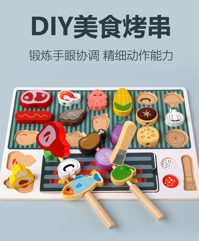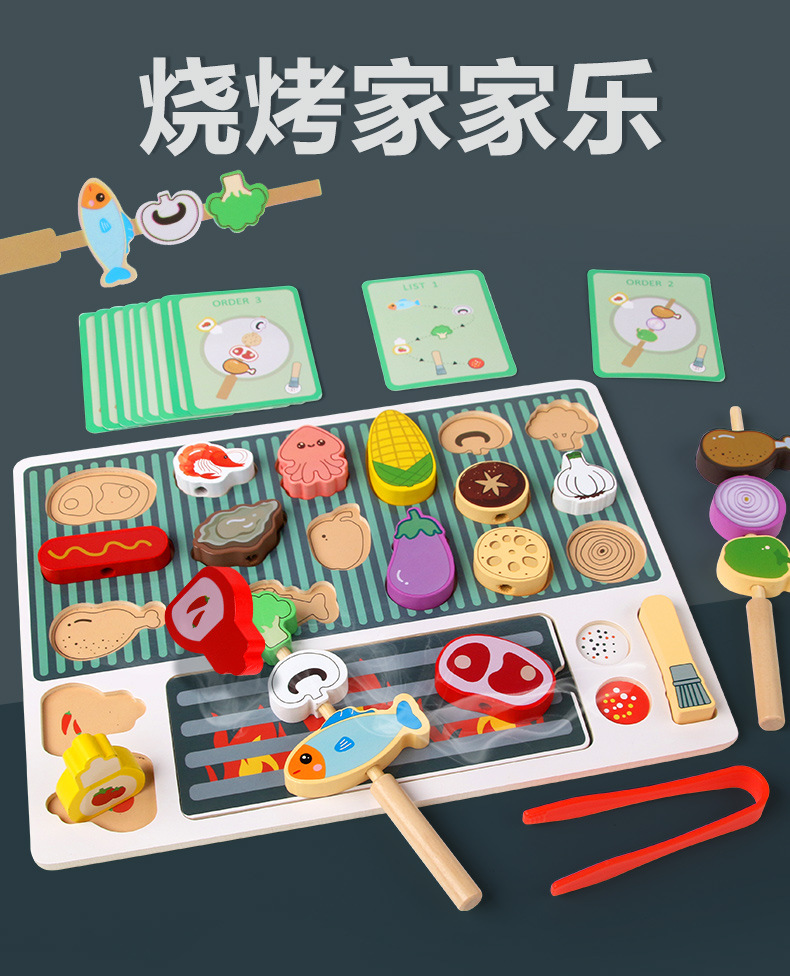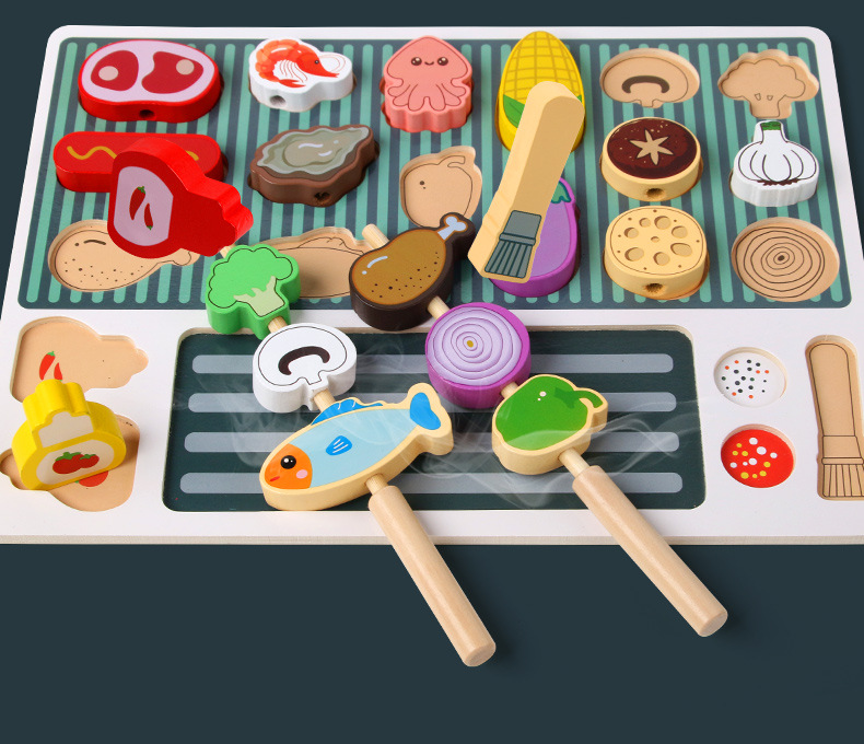 Children's wooden simulation barbecue grill set, boys' and girls' kitchen skewer building blocks, house play kitchen toys